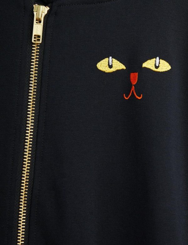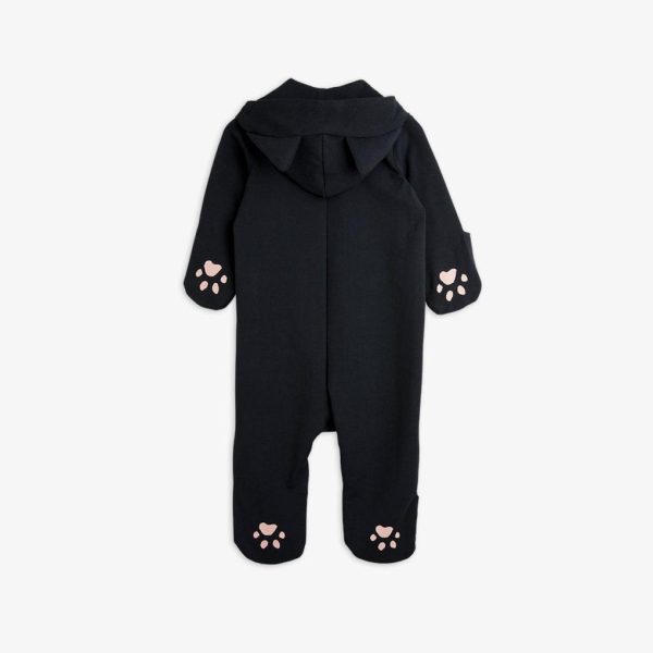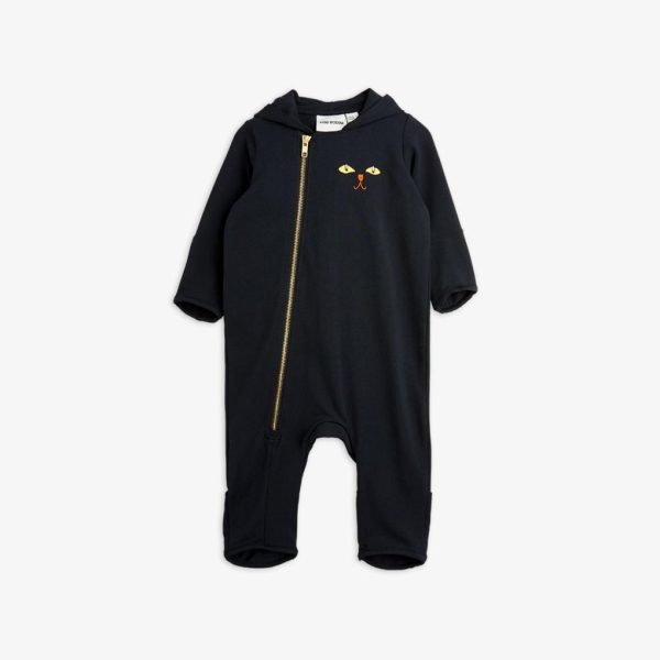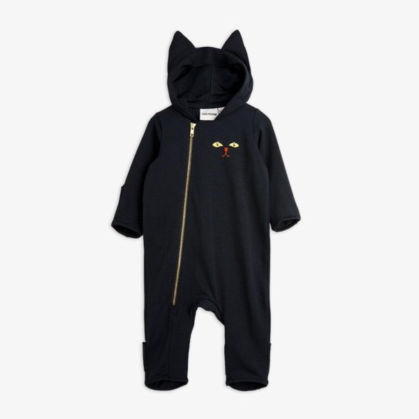 Baby onesie with cat ears and cat themed prints, made from organic cotton with stretch. Designed with folded cuffs at sleeve and leg ends, along with an asymmetrical zip.