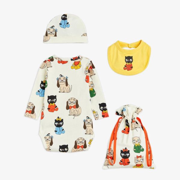 Baby kit including a long sleeved body and a hat with all over Mini Babies print along with a baby bib, made from GOTS certified organic cotton with stretch. The hat features a soft elastic around the head. The body is designed with snap buttons at the shoulder and crotch for easy dressing. The bib is designed with snap buttons to achieve the perfect fit. The kit comes with a matching drawstring bag.The print Mini Babies was created by Cassandra Rhodin, Founder and Creative Director, in 2020. She was inspired by the idea that the Mini Rodini cat and Dashing Dog had kids. A personal favorite of Cassandra, now Mini Babies relaunches, for a small collection of organic styles.To see which size of the hat that comes with each set, see below:Size 56/62: 40/42 (approx 1-4 months)Size 68/74: 44/46 (approx 4-9 months)Size 80/86: 48/50 (approx 9 months-1,5 years)