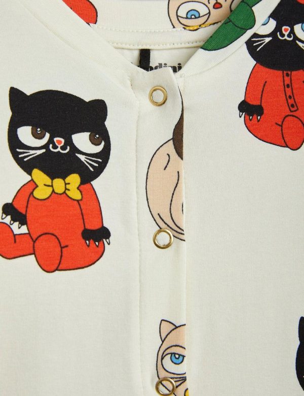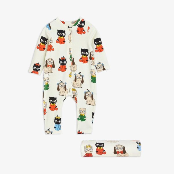 Jumpsuit and baby blanket with all over Minibabies print made from GOTS certified organic cotton with a hint of stretch. The jumpsuit features a snap button closure along the front. Blanket features sewn on bindings around the edges and measures 110 x 110 cm (43″ x 43″).