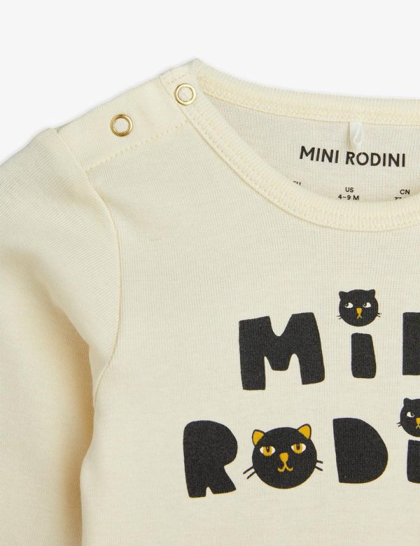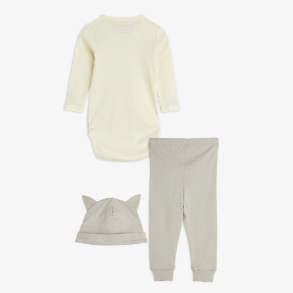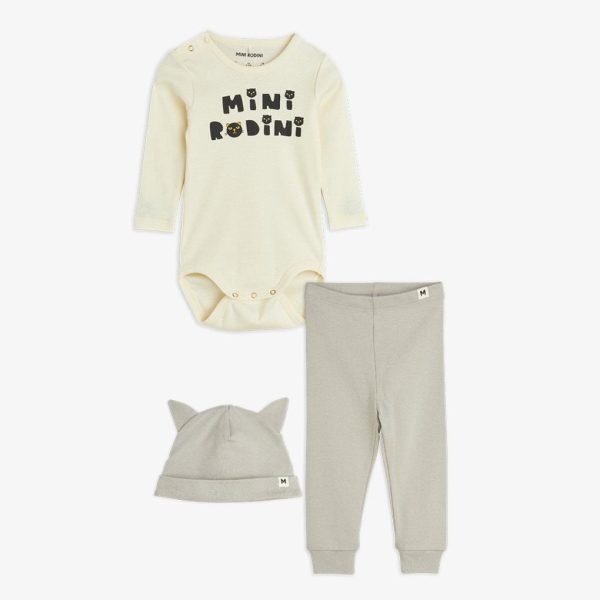 Baby set with bodysuit, leggings and beanie, made from 100 % GOTS certified organic cotton. Bodysuit features a Mini Rodini Cats print, long sleeves and snap buttons at crotch and shoulder. The leggings are designed with a wide elastic waist, cuffs at leg ends and a Mini Rodini M label on the waistband. The beanie features a folded brim, sewn-on cat ears and a Mini Rodini M label.