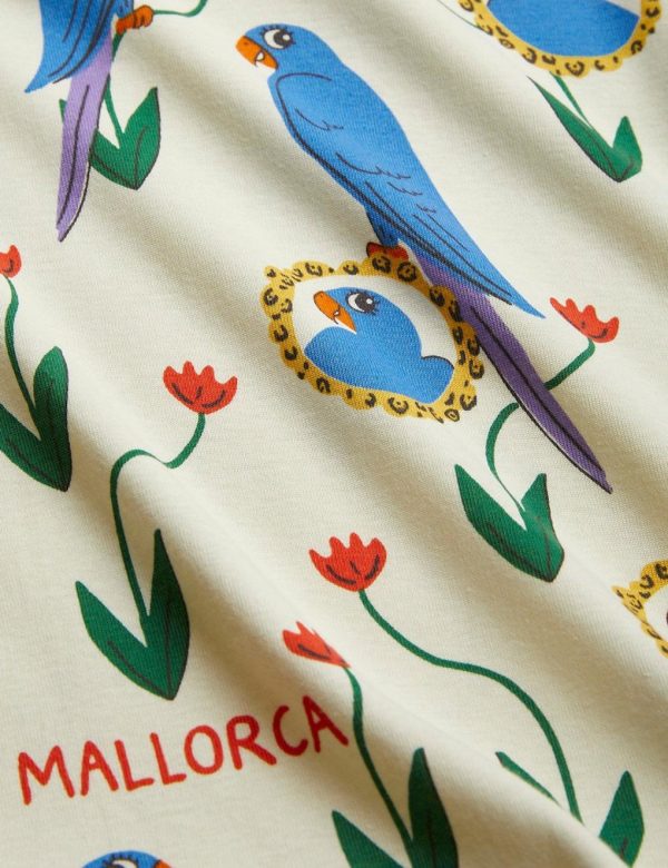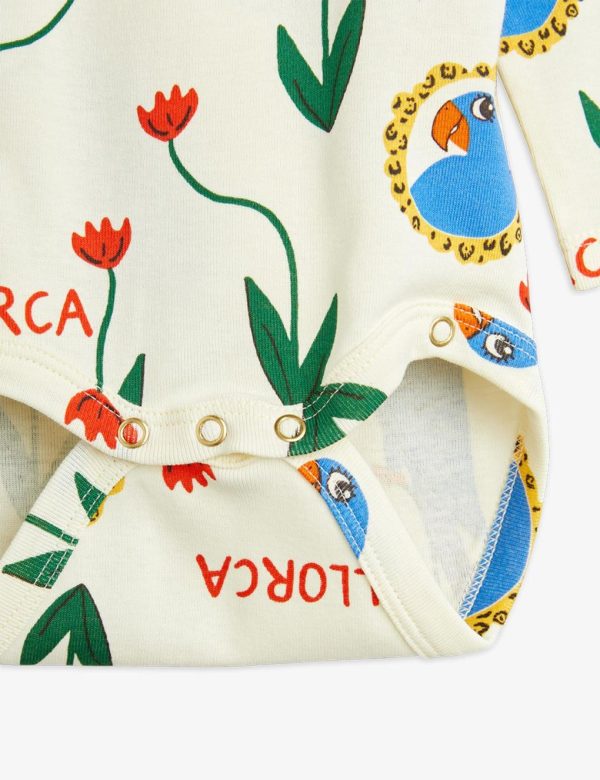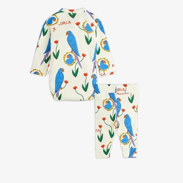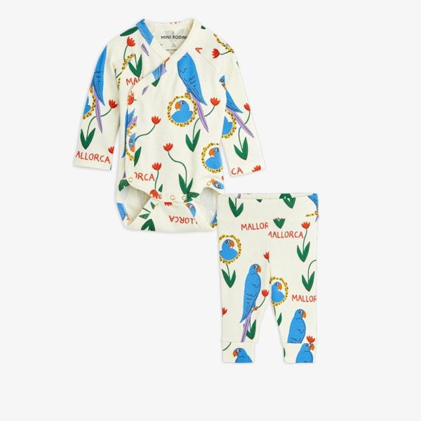 Newborn bundle with a wrap bodysuit and leggings with all over Parrots print, made from 100 % GOTS certified organic cotton. The body is designed with snap button closure along the front for easy dressing and the leggings feature a soft elastic waist with cuffs at the leg ends.