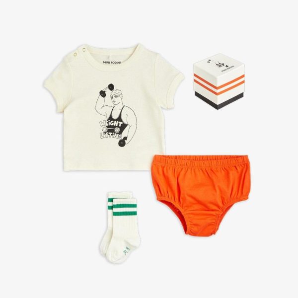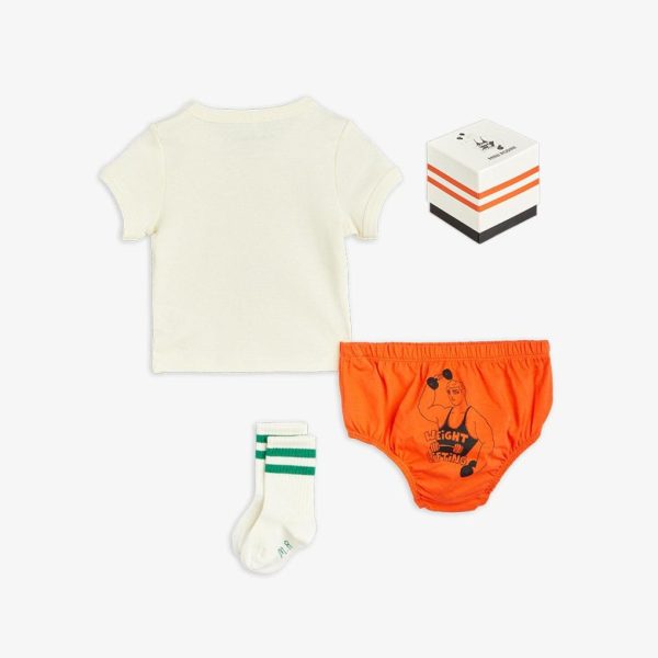 Baby gift set consisting of a T-shirt, bloomers and a pair of socks made from GOTS certified organic cotton, delivered in a Mini Rodini branded gift box made from FSC certified paper. The T-shirt is designed with bindings at neck and sleeve ends along with snap buttons at the shoulder. The bloomers feature elastic trims. The socks have reinforced toe caps and heels and ribbed shafts.
