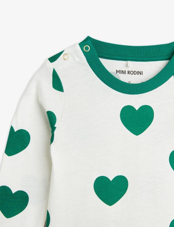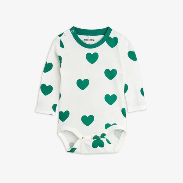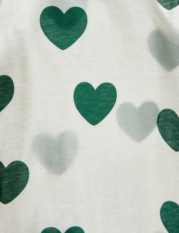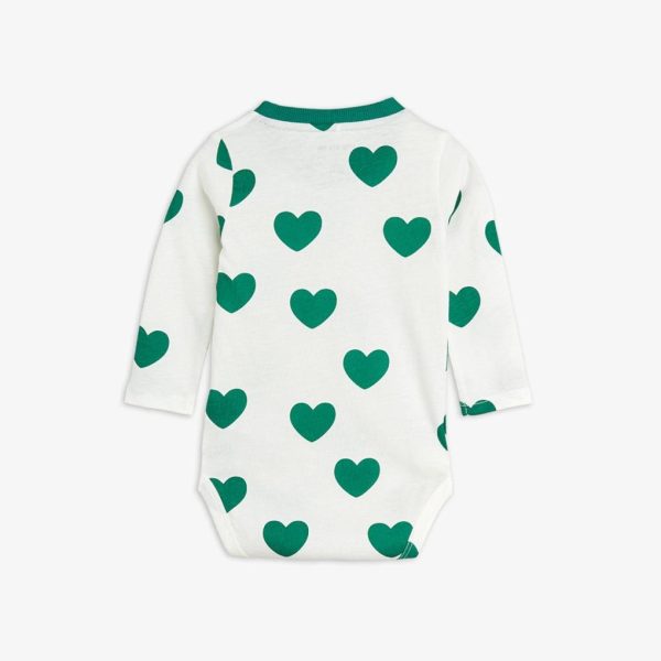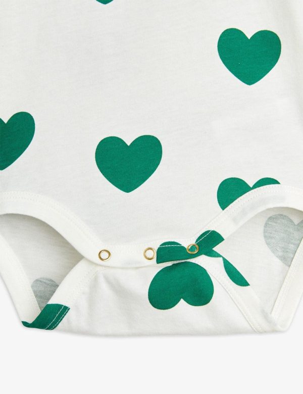 Bodysuit made from 100 % GOTS certified organic cotton. Decorated with an all over Hearts print and a ribbed contrasting collar. Features snap buttons at shoulder and crotch for easy dressing.