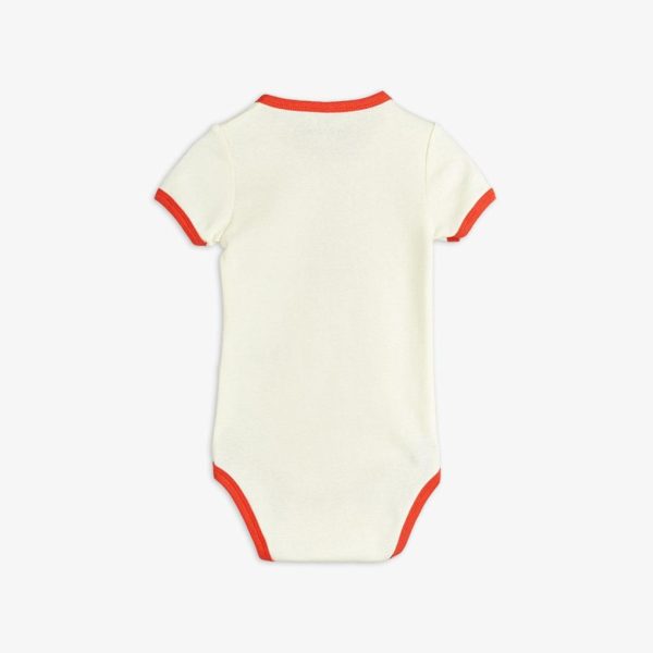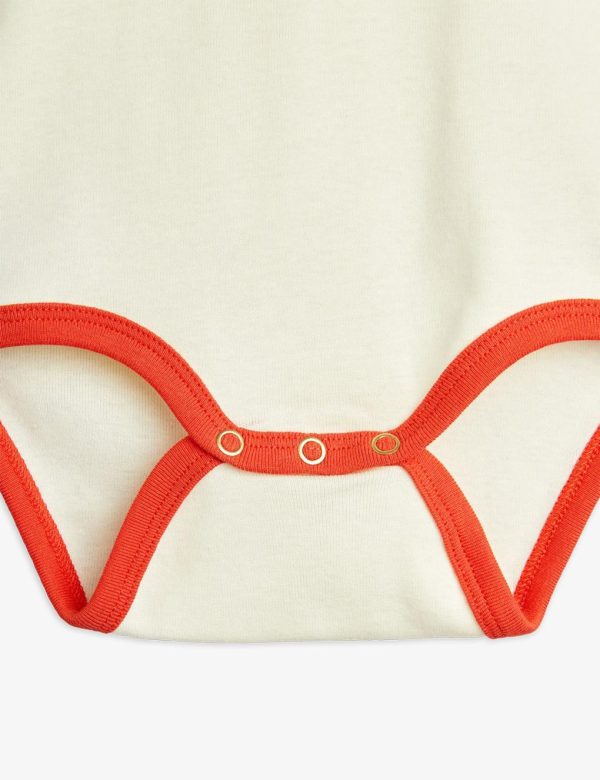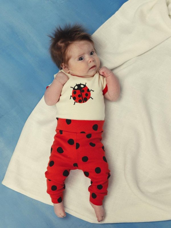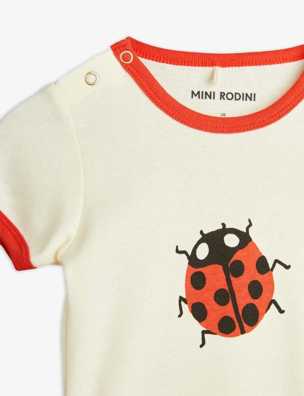Off white bodysuit with a Ladybug print, made from GOTS certified organic cotton with a hint of stretch. The bodysuit is designed with contrasting bindings, short sleeves and snap buttons at the shoulder and crotch for easy dressingFeatures