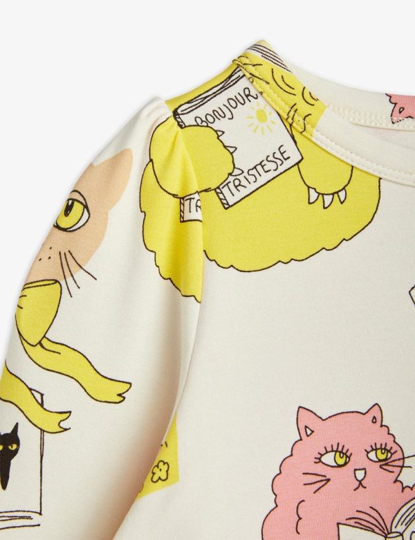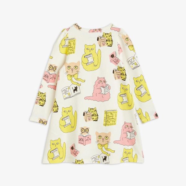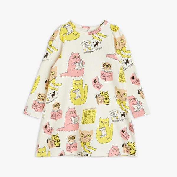 Off white long sleeve dress with an all over Reading Cats print, made from GOTS certified organic cotton with a hint of stretch. The dress is designed for an A-line fit with puffed sleeves. Snap buttons at shoulder in size 56/62–68/74 for easy dressing.