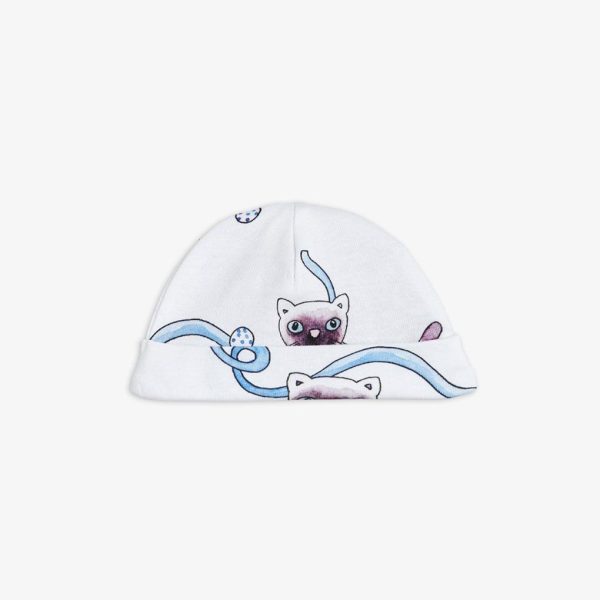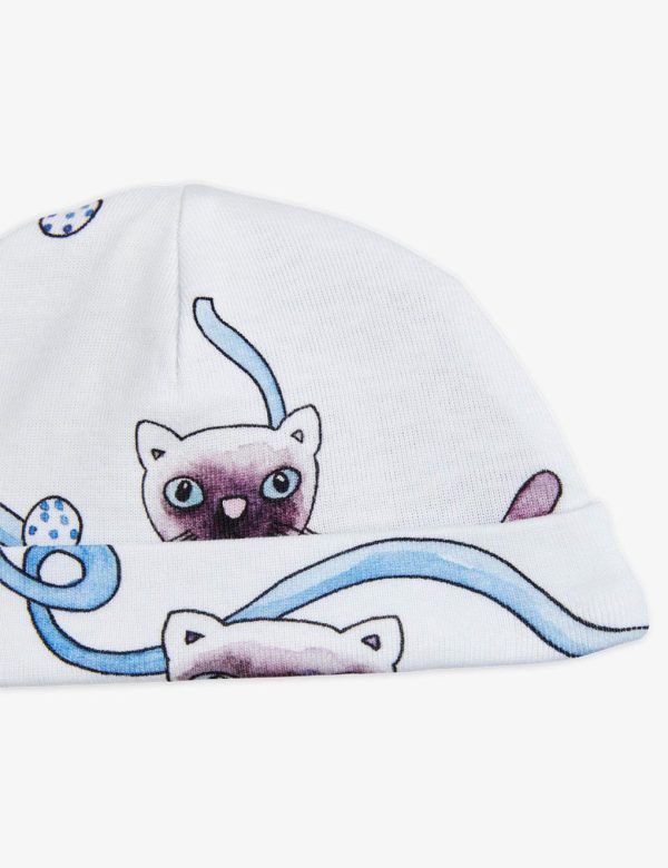 White baby beanie with an all over Siamese Cats print made from 100 % GOTS certified organic cotton. Designed with a folded hem.