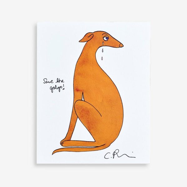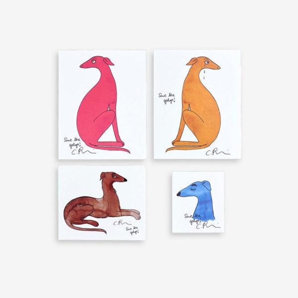 Save the Galgo! Artworks by Cassandra Rhodin. Galgo dogs in colourful pink, orange, blue and brown and all posters are signed in print. Comes in a 4-pack, without frames, and the sizes are: