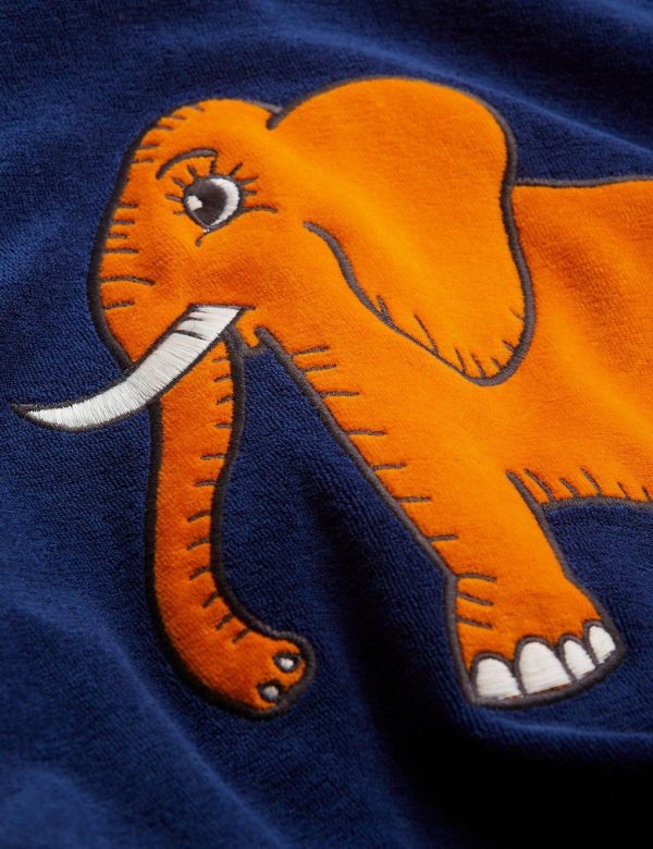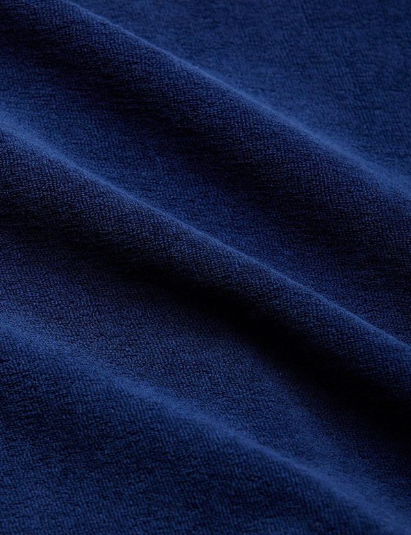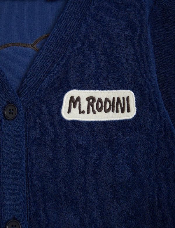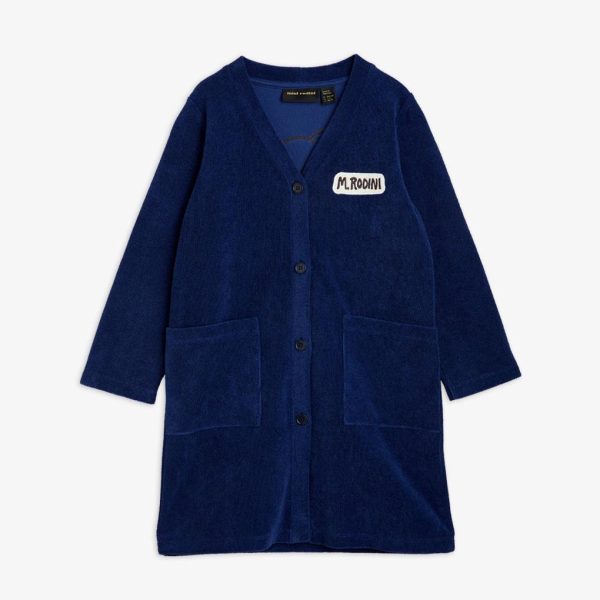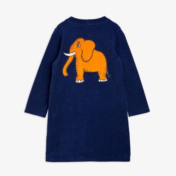 Blue terry robe featuring an M.Rodini patch on the chest and a large 4 Elephants embroidery on the back, made from 100 % GOTS certified organic cotton terry. Designed with two front pockets and blue corozo buttons in the front.