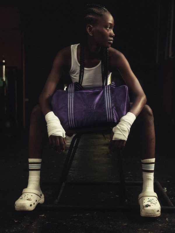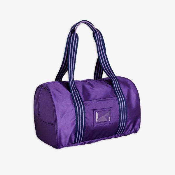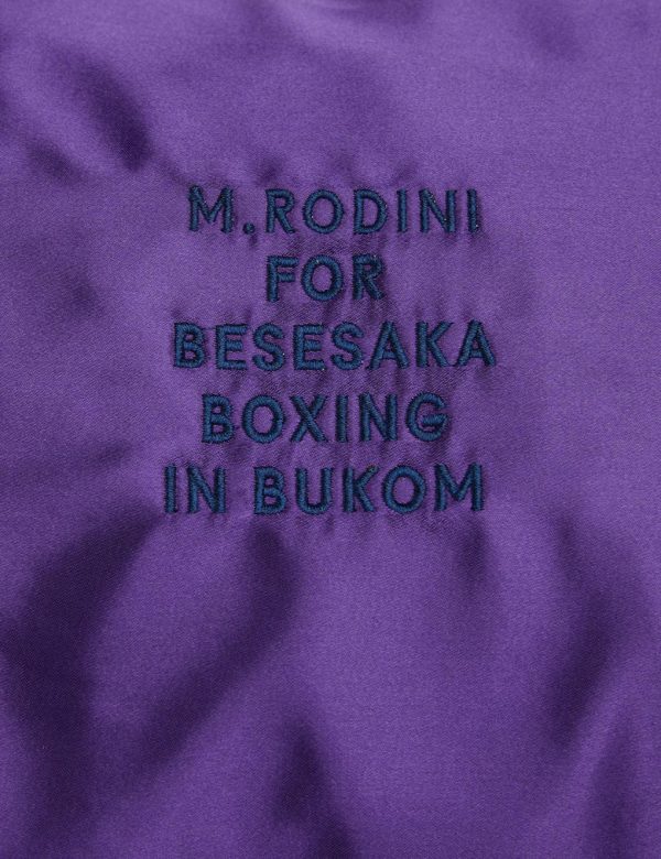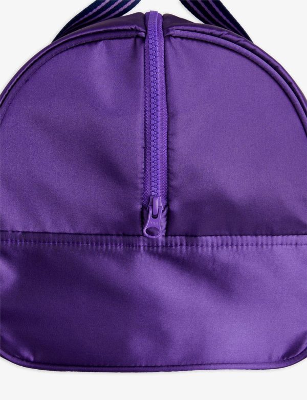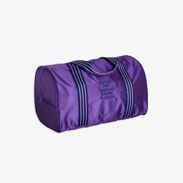 Satin gym bag with M.Rodini for Besesaka collab embroidery, made from 100 % recycled polyester. Designed with an outside pocket with a transparent window for name tag and striped carrying handles. The bag measures 42x24x24cm.