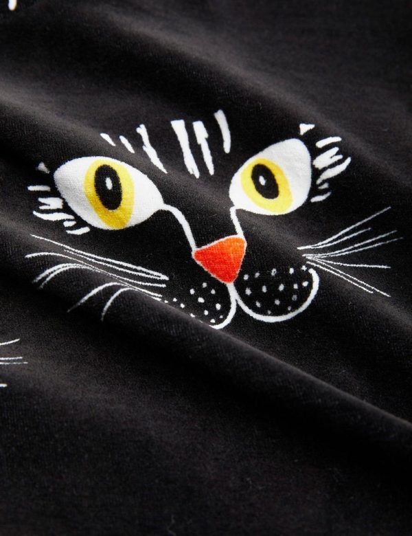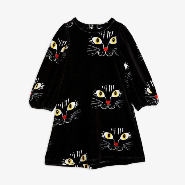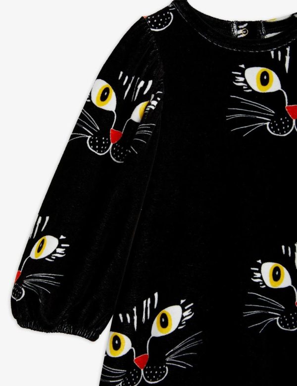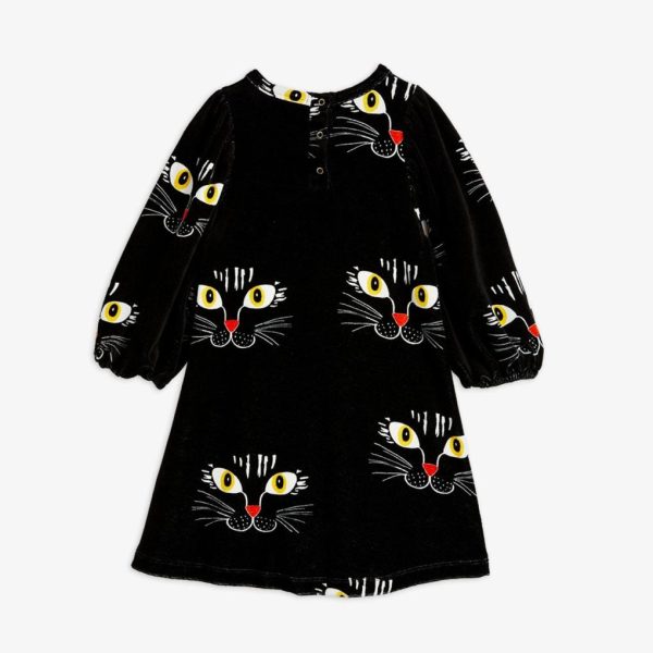 Black puff sleeve velour dress with an all over Cat Face print, made from 100 % GOTS certified organic cotton. Knee length. Features elastic cuffs at sleeve ends and snap button closure in the back.