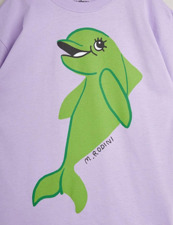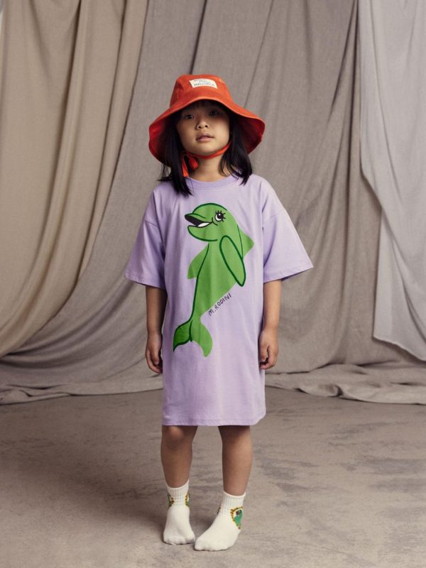 Knee length T-shirt dress with a large Dolphin print, made from 100 % GOTS certified organic cotton. Designed for a loose fit with dropped shoulders and finished with a ribbed collar.