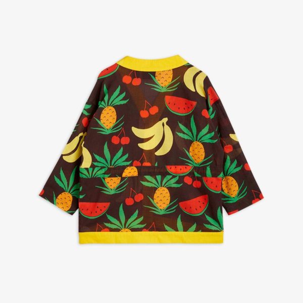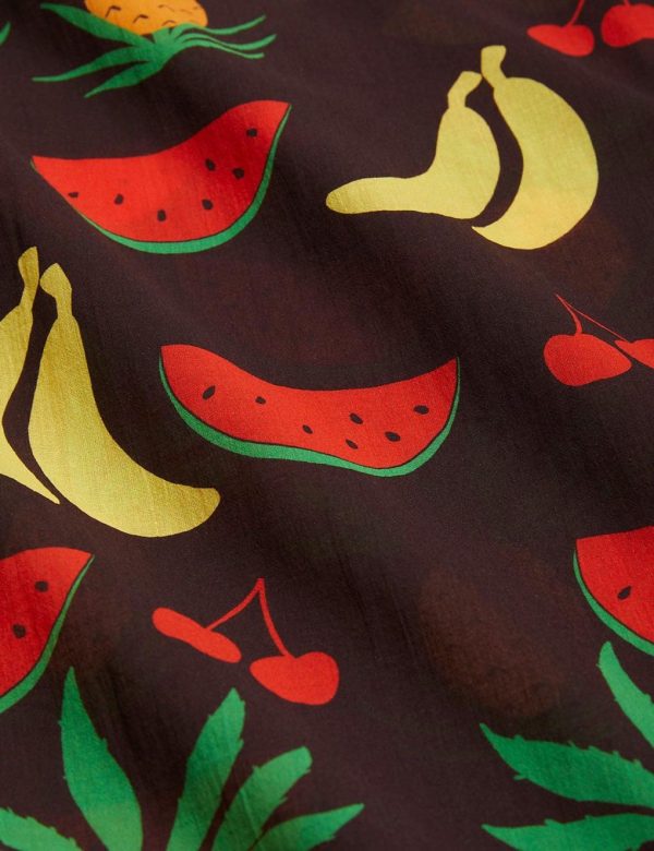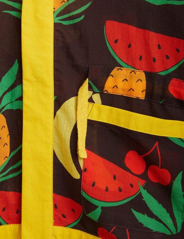 Brown woven tunic with all over Fruits print, made from 100 % GOTS certified organic cotton. The tunic is designed with hidden snap buttons in the front, an adjustable waist with a tie belt along with slightly dropped shoulders for a relaxed fit.