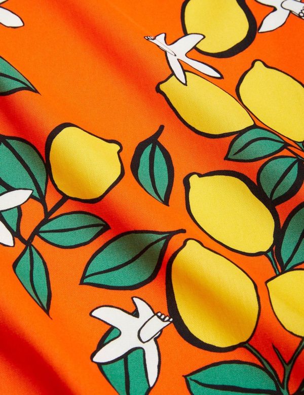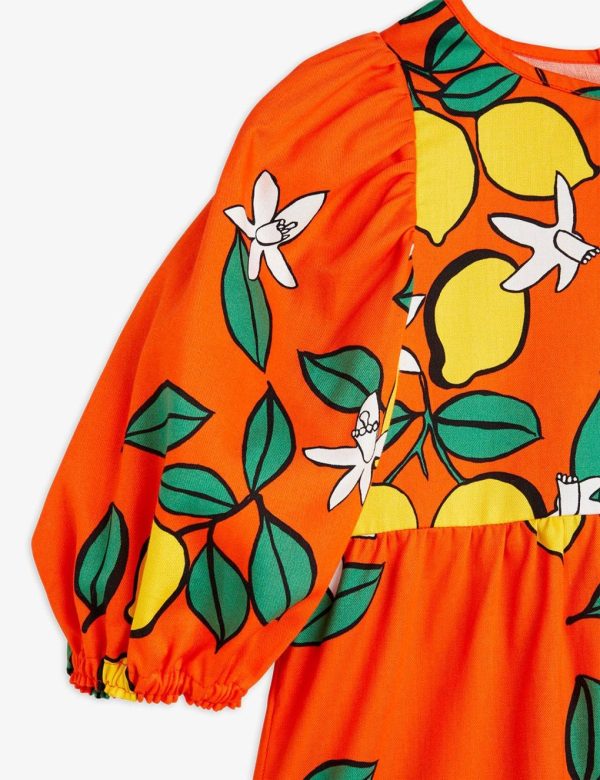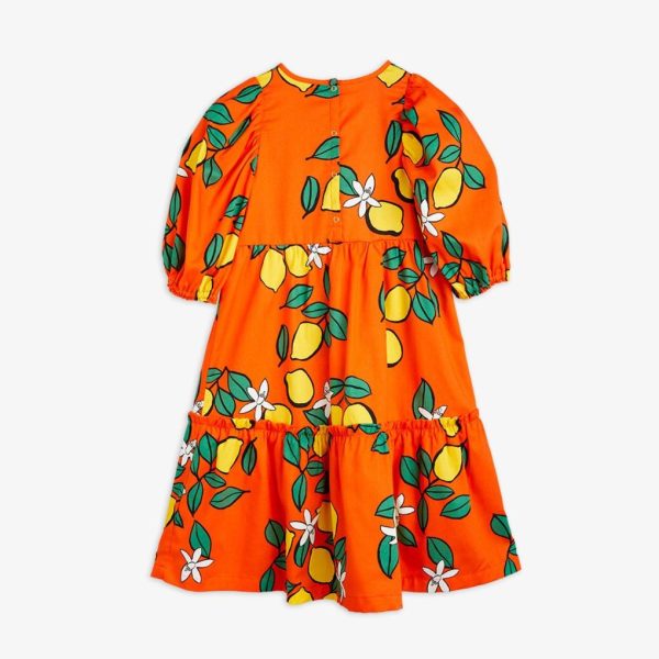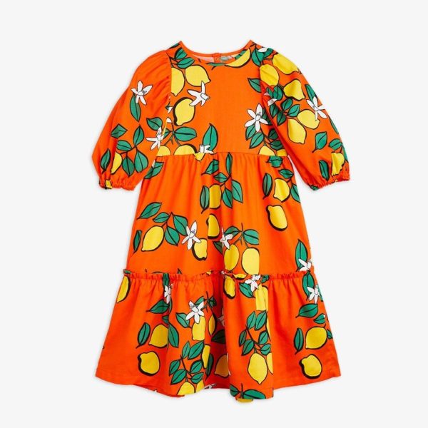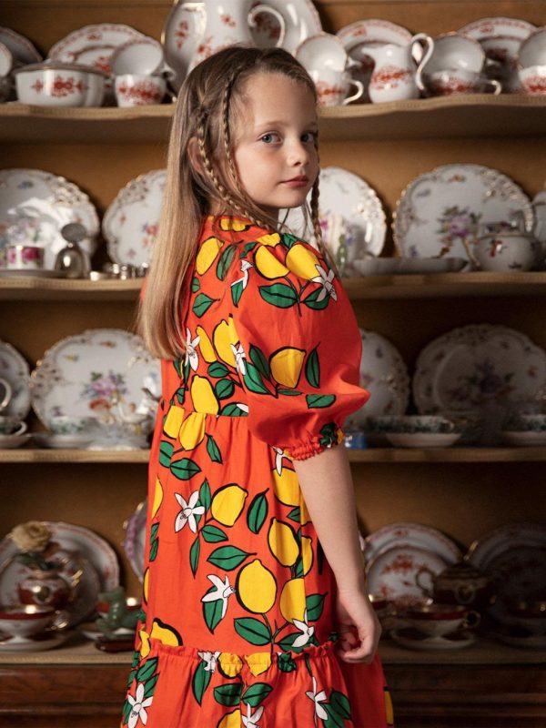 Red woven puff sleeve dress with an all over Lemons print, made from 100 % GOTS certified organic cotton. Designed with elastic cuffs at sleeve ends and a long layered skirt. Ends slightly above the ankle.