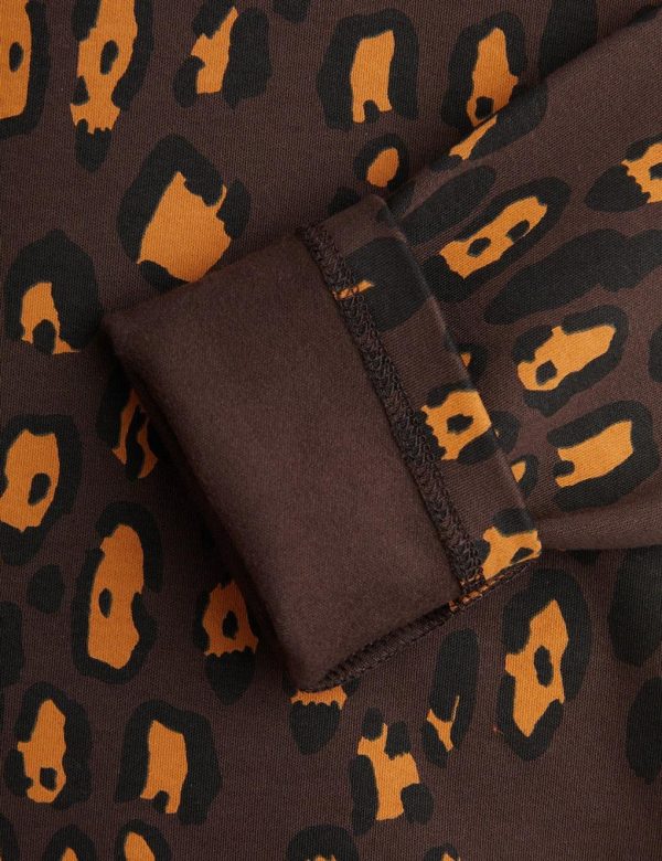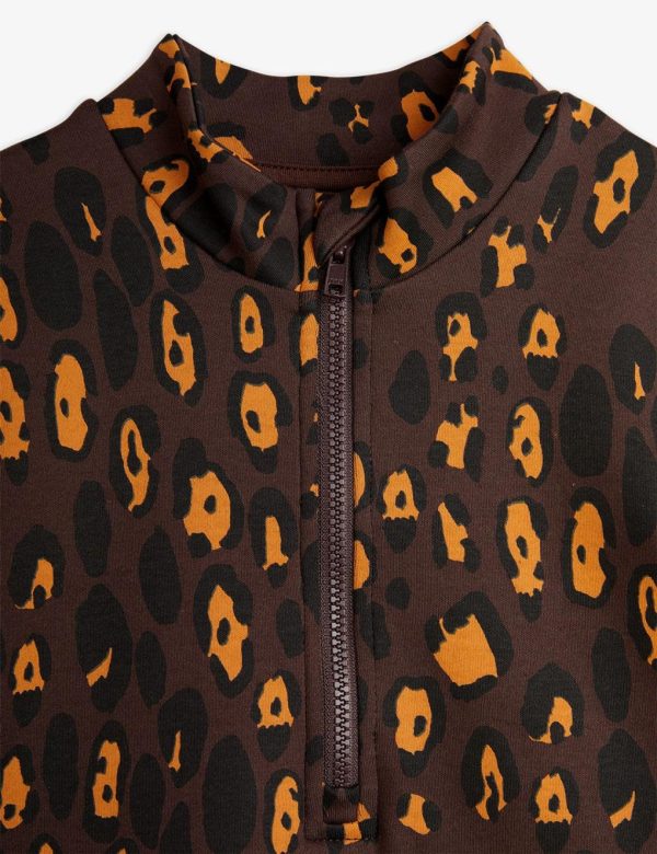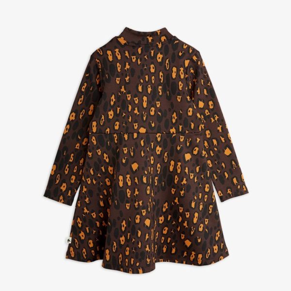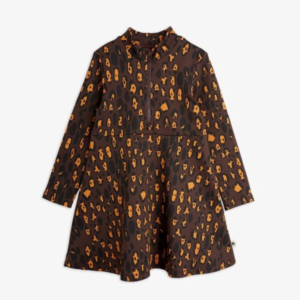Heavyweight cotton dress with brushed inside and an all over Leopard pattern, made from GOTS certified organic cotton. Designed with a high neck and half-zip. Finished with a Mini Rodini Panther label. The material is stiffer than our regular cotton jersey, and is similar to sweat material in structure and feel.