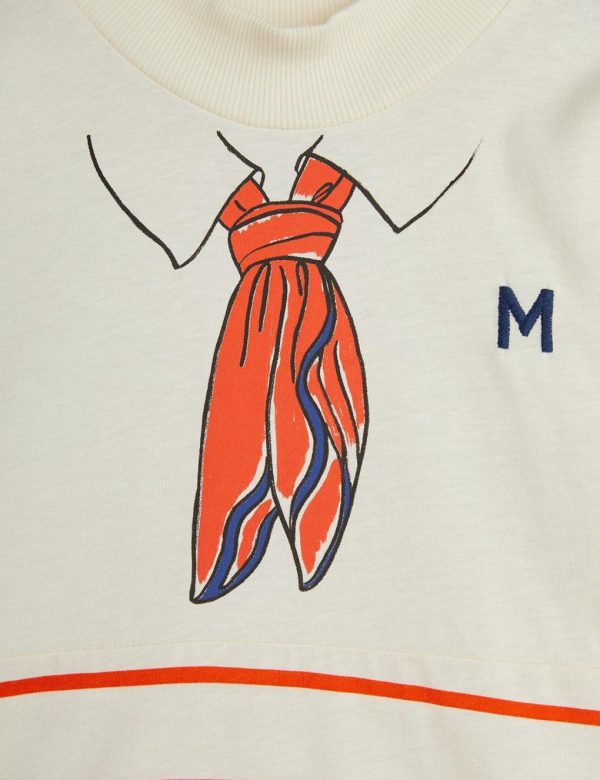 and a ribbed collar. Decorated with a scarf and collar print, finished with an M embroidery in front. The model is 123 cm tall and is wearing a size 116/122.