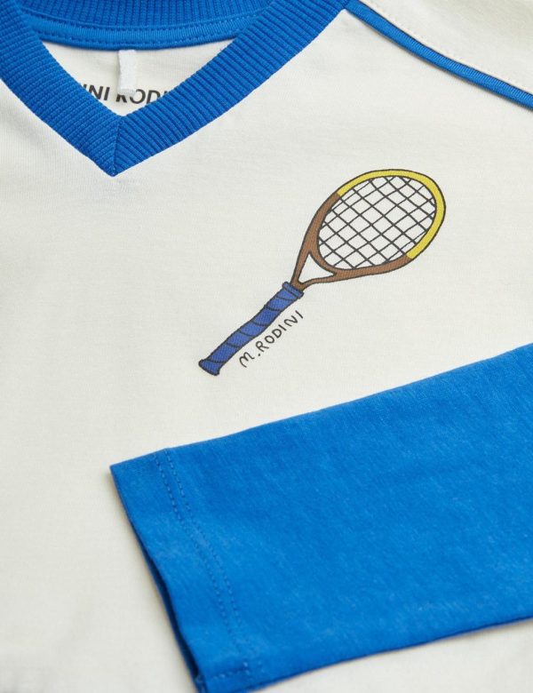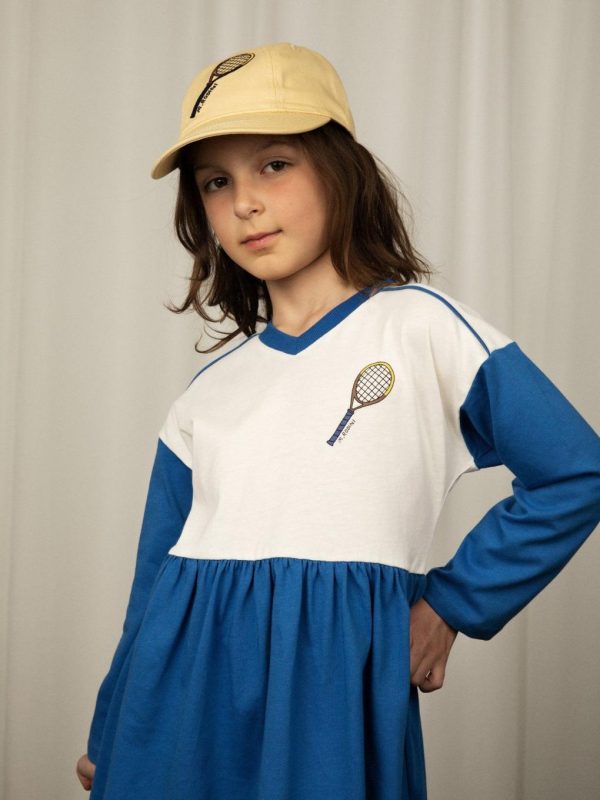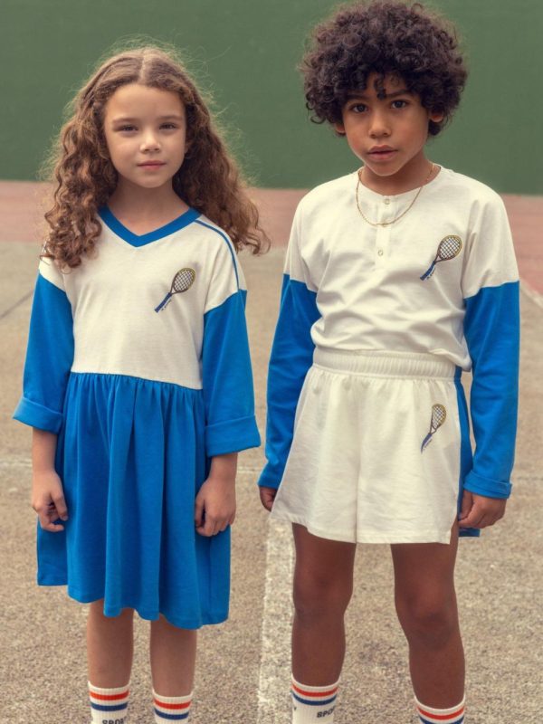 Dress made from 100 % GOTS certified organic cotton. Designed with dropped shoulders, ribbed v-neck collar, and contrasting sleeves and skirt. Decorated with a Tennis print on the chest and contrasting piping.
