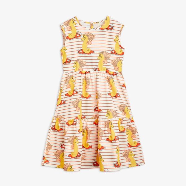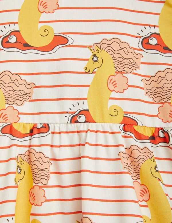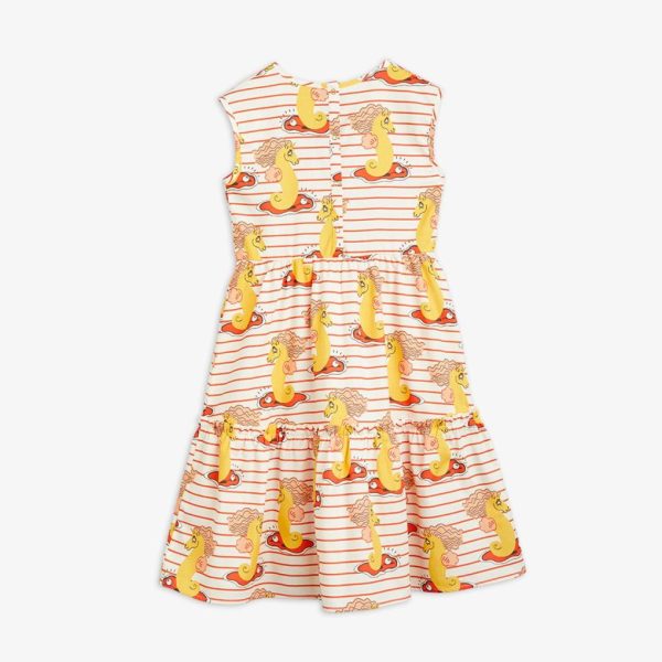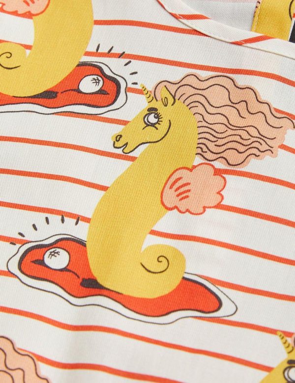 Woven sleeveless dress with an all over Unicorn Seahorse print, made from 100 % GOTS certified organic woven cottton. Designed with a high waist, a long skirt and snap button closure in the back.