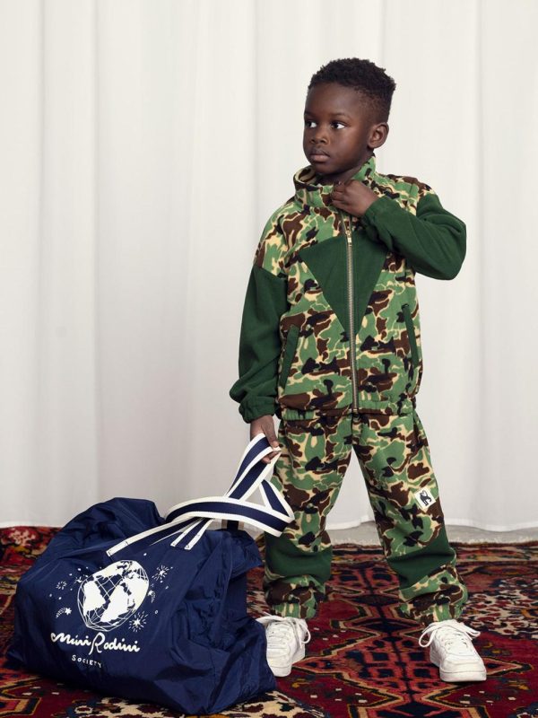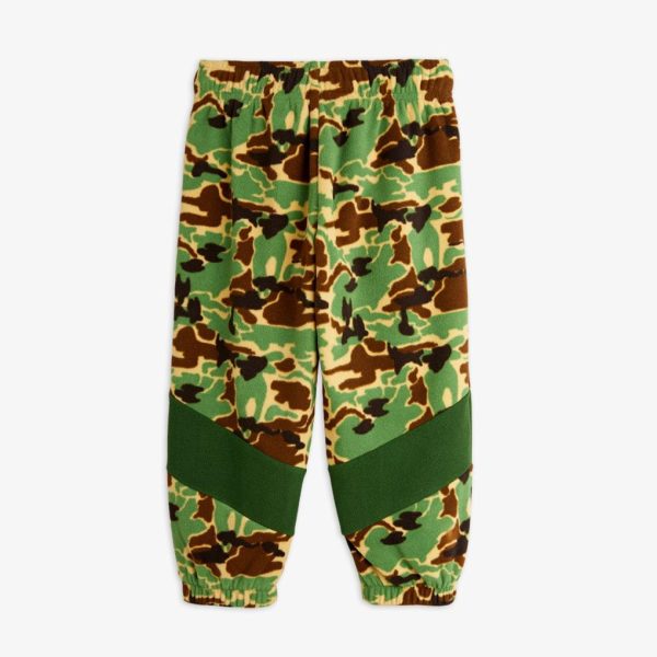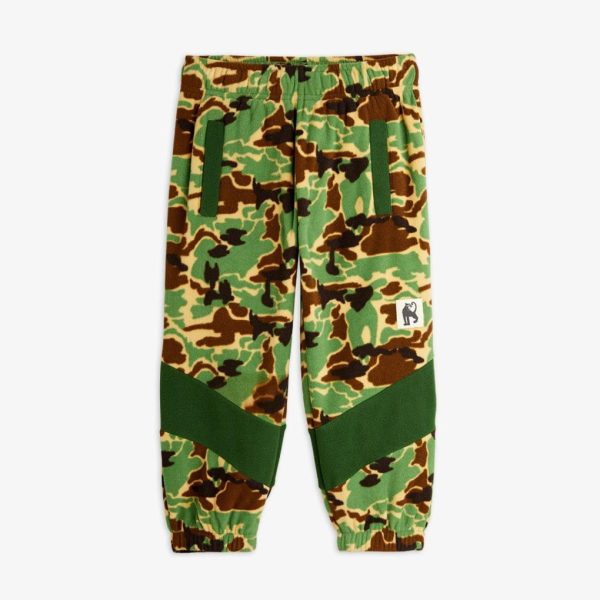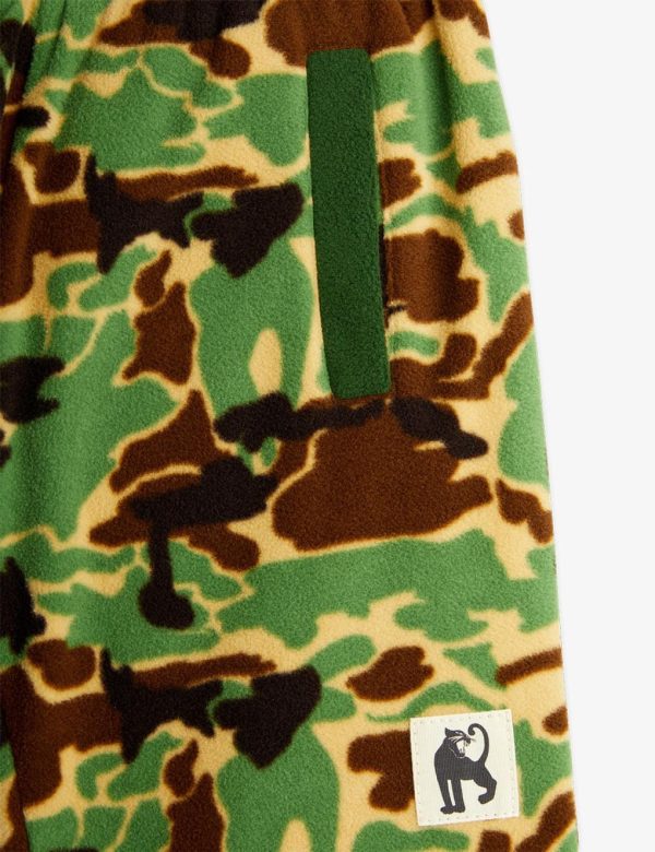 Camo pattern fleece trousers made from 100 % recycled polyester. Designed with two side pockets, a fake pocket in the back with a Mini Rodini Panther label sewn on, as well as soft cuffs by the ankles and an elastic drawstring waist.