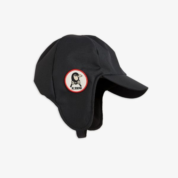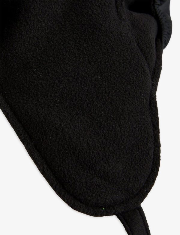 Thermo cap in black made from 100 % recycled polyester featuring warming earflaps and a twill penguin patch on the side. The cap features elastic in the neck for a better fit as well as an adjustable strap to button under the chin. The cap is highly breathable and water resistant, made of a functional and heavy-duty shell fabric finished with a more environmentally friendly water repellent BIONIC-FINISH® ECO coating, free from harmful chemicals.