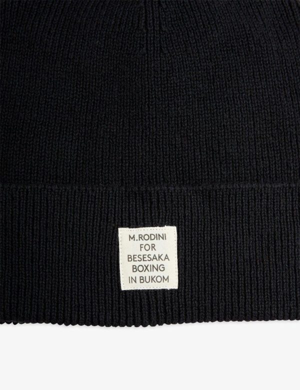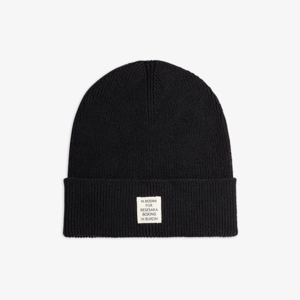 Knit beanie for adults and older kids in a GOTS certified organic cotton and wool blend. Designed with a folded brim and finished with a Mini Rodini for Besesaka collab patch.