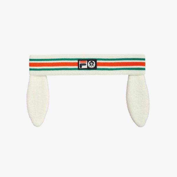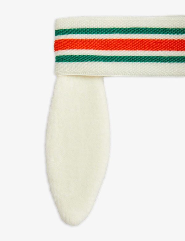 Striped headband featuring downturned rabbit ears, made from stretchy recycled polyester. Designed with an anti-slip rubber strip on the inside and finished with a FILA x Mini Rodini collaborative logo patch on the front.