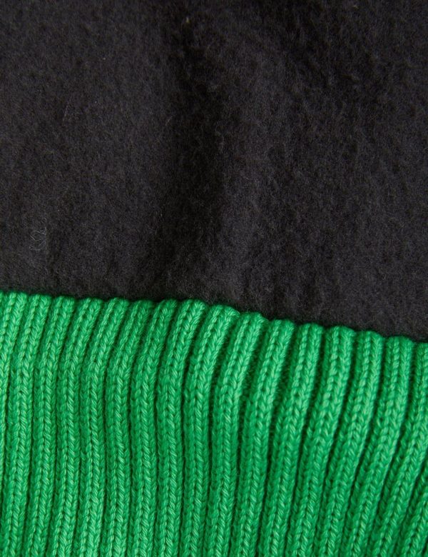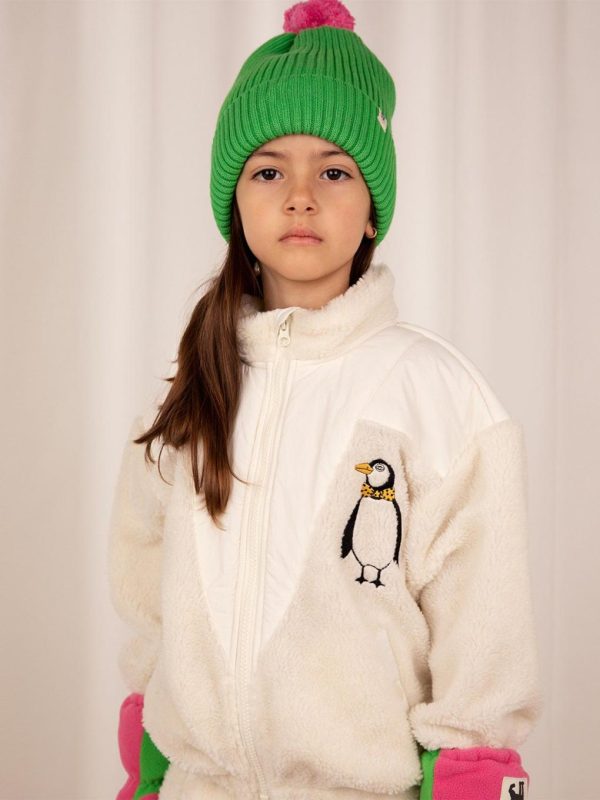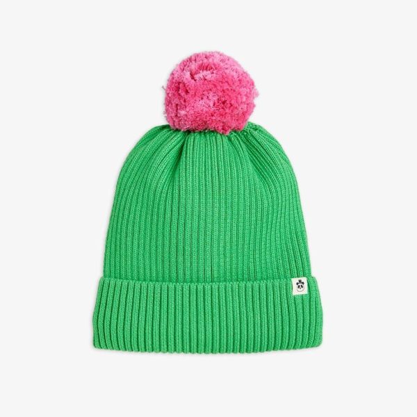 Green fleece lined knit beanie made from 100 % organic cotton featuring a pom-pom on the top and a folded Mini Rodini Panda label on the brim. Sizes 44/46 and 48/50 has a strap attached to tie under the chin.