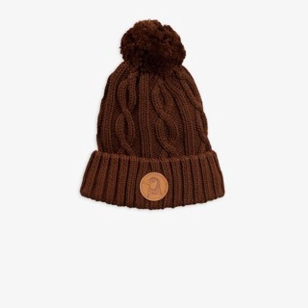 Brown cable knitted beanie in 100 % organic cotton featuring a pom-pom on top, a folded brim, and a faux leather penguin patch on the side.