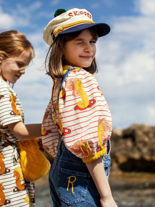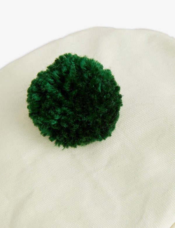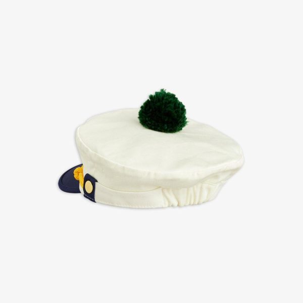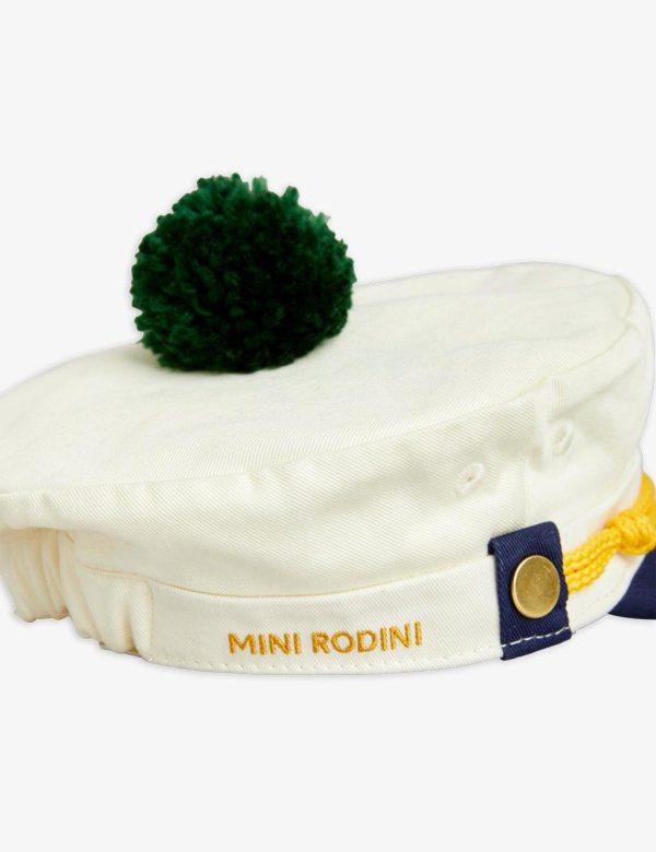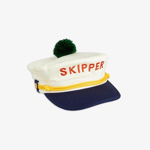 Skipper hat with a Skipper embroidery made from 100 % organic cotton. The cap is designed with a pom pom on the top, gold metal buttons on the sides and a decorative braided twine over the visor. The back features elastic for a comfortable fit.