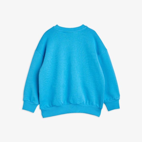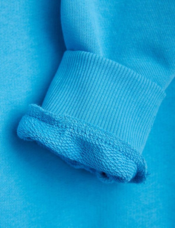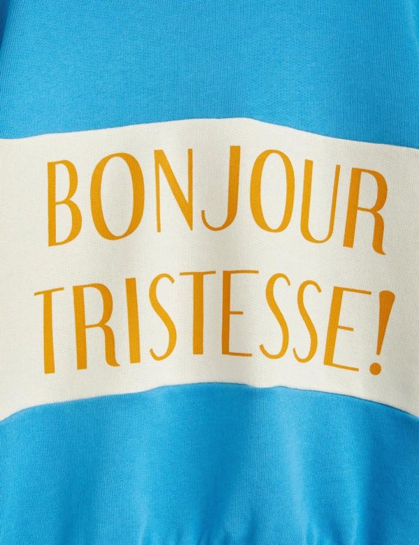 Blue sweatshirt with a white panel adorned with a Bonjour Tristesse print, made in 100 % GOTS certified organic cotton. The sweatshirt is designed with ribbed trims and dropped shoulders for a relaxed fit.