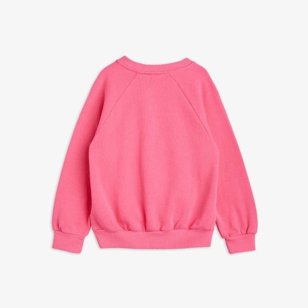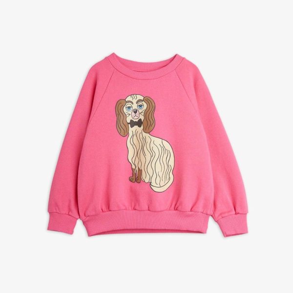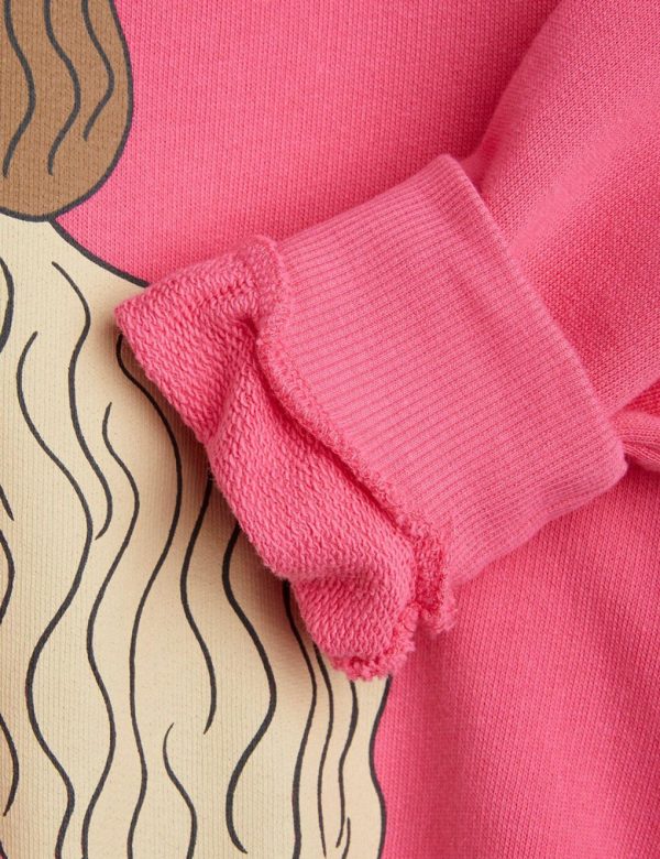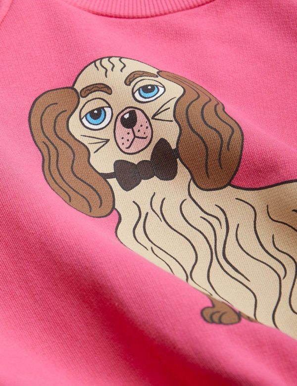 Pink sweatshirt featuring a large Dashing Dog print in the front, made from 100 % GOTS certified organic cotton. The sweatshirt is designed with raglan sleeves, rib at the neck, sleeve ends and bottom hem.