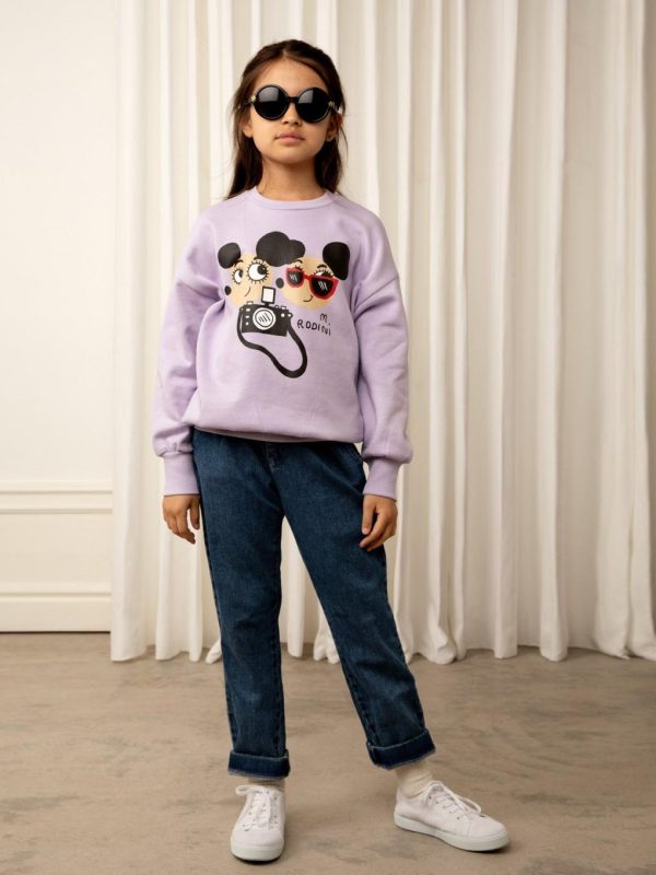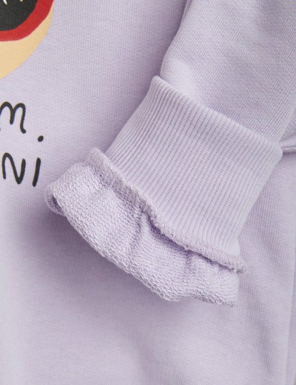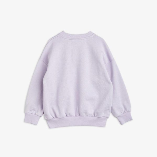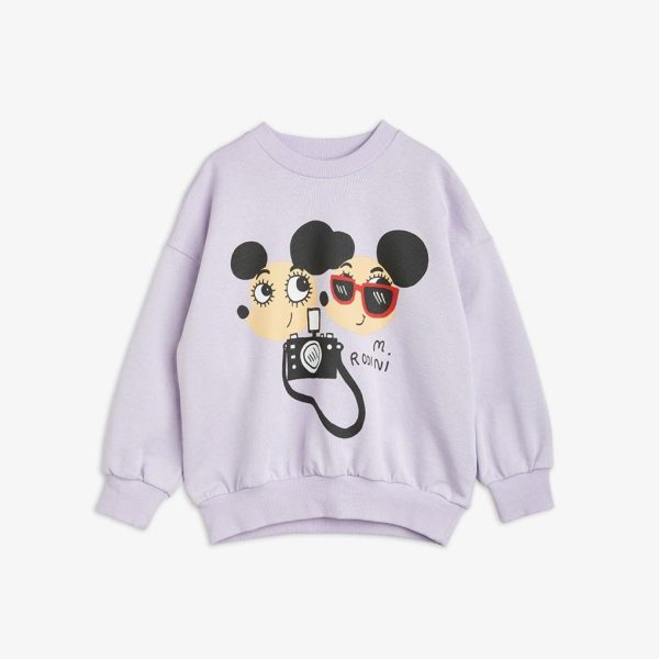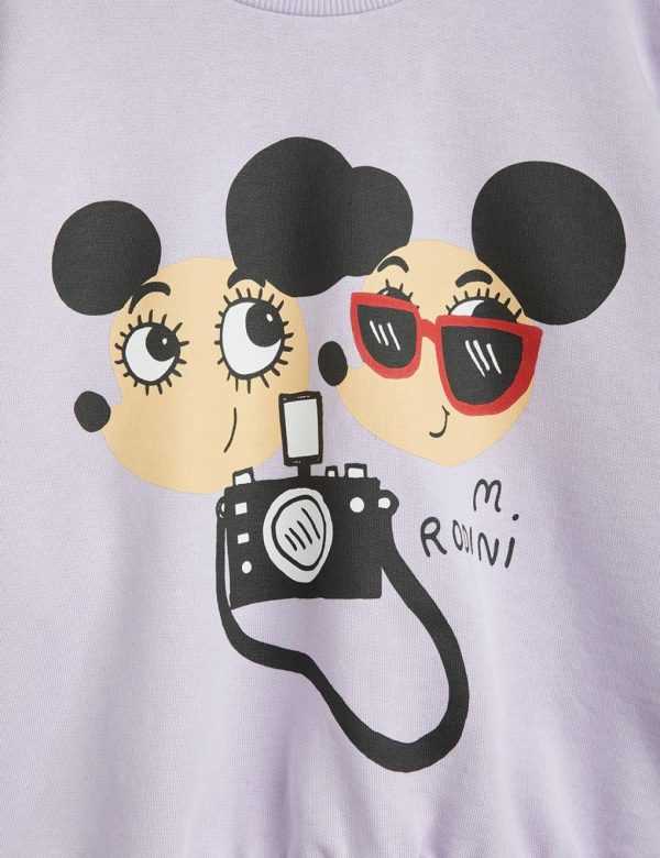 Purple sweatshirt featuring a large Ritzratz print in the front, made from 100 % GOTS certified organic cotton. The sweatshirt is designed with dropped shoulders for a relaxed fit and features a ribbed neck, sleeve ends and bottom hem. Snap buttons at shoulder in size 56/62–68/74 for easy dressing.