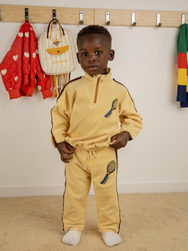 Half zip sweatshirt in Terry fabric, made from 100 % GOTS certified organic cotton. Designed with a high neck and dropped shoulders. Finished with a Tennis embroidery on the chest and stripe detailing along the sleeves.