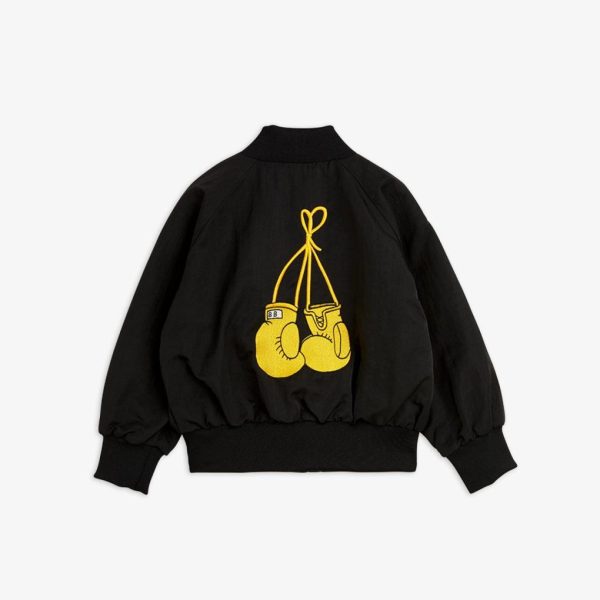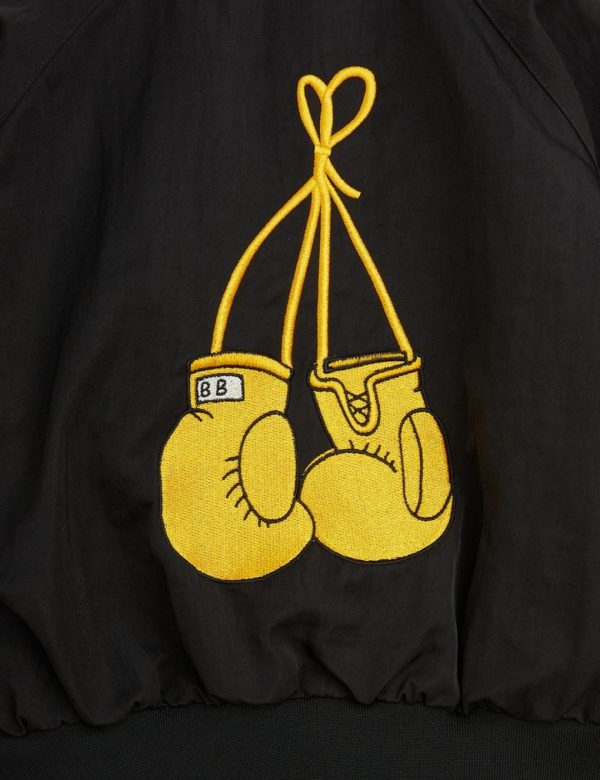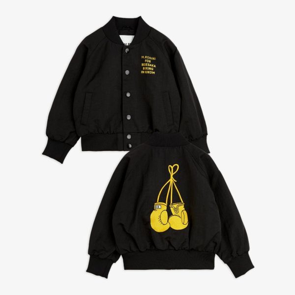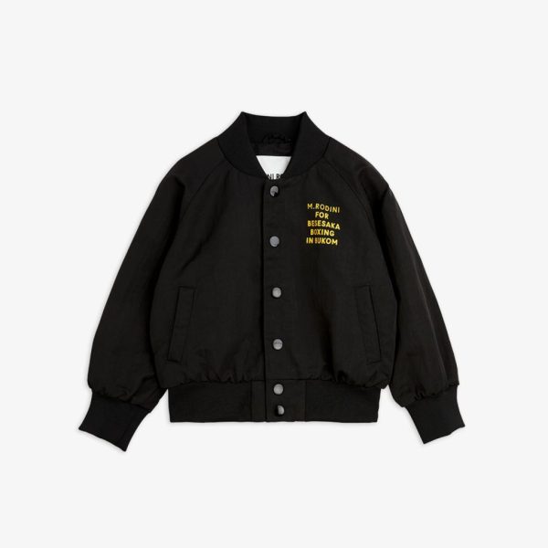 Satin baseball jacket with a Mini Rodini for Besesaka print on the chest and a large back embroidery, made in 100 % recycled polyamide. The jacket is lightweight and unpadded with a recycled polyester jersey lining and features a poison free water repellent BIONIC-FINISH® ECO coating. Designed with snap button closure, elastic trims and side pockets.