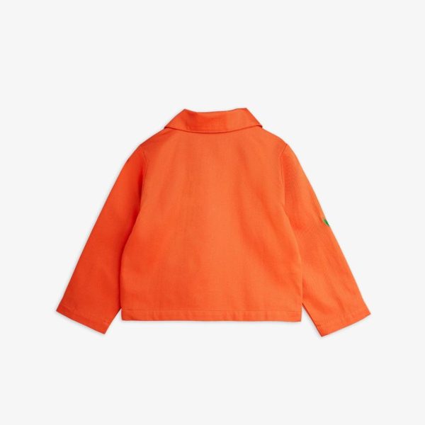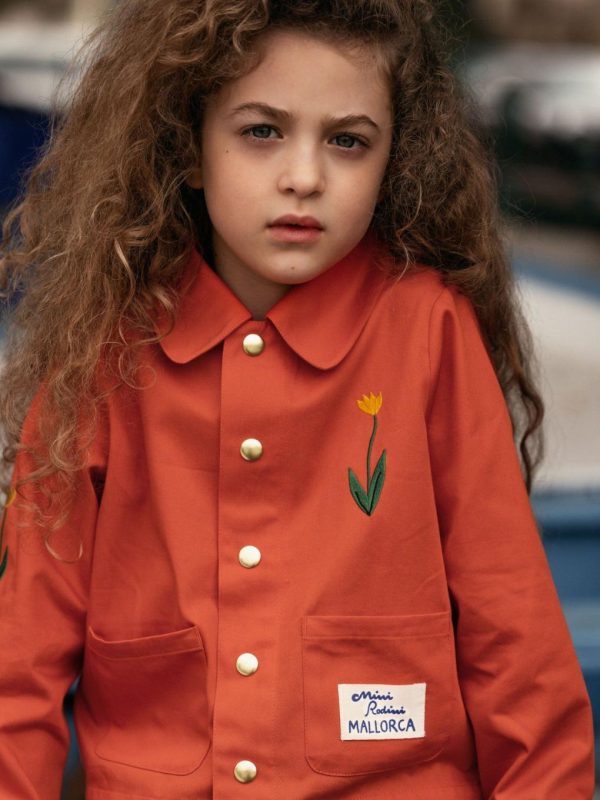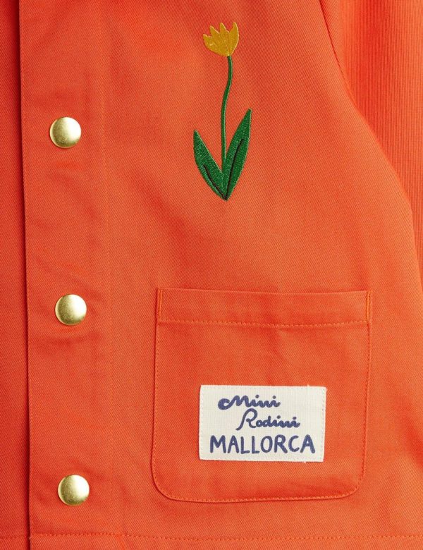Chore coat made from 100 % GOTS certified organic cotton twill. Decorated with a sewn on Mallorca patch on the left front pocket, along with embroidered Flower motifs on the chest and right sleeve. The jacket features two front pockets, a snap button closure and a pointed collar.