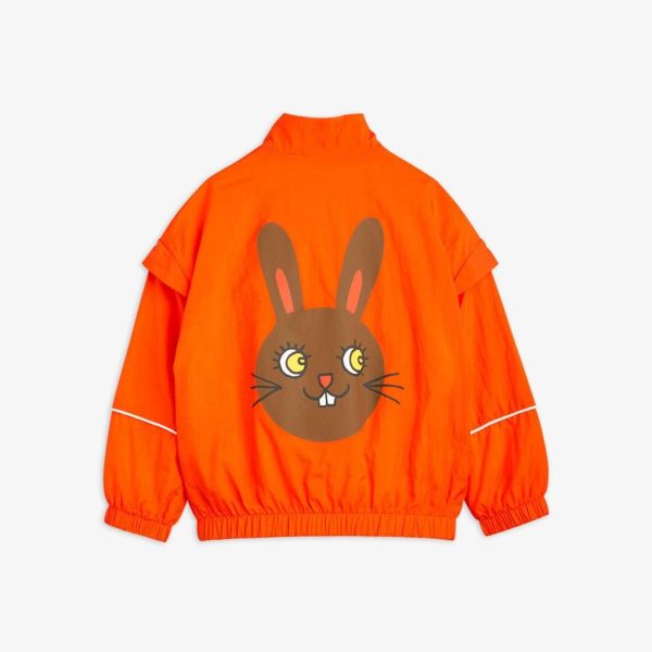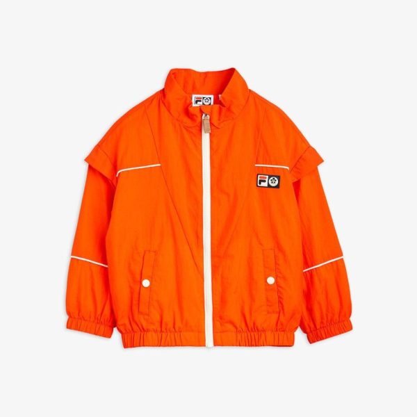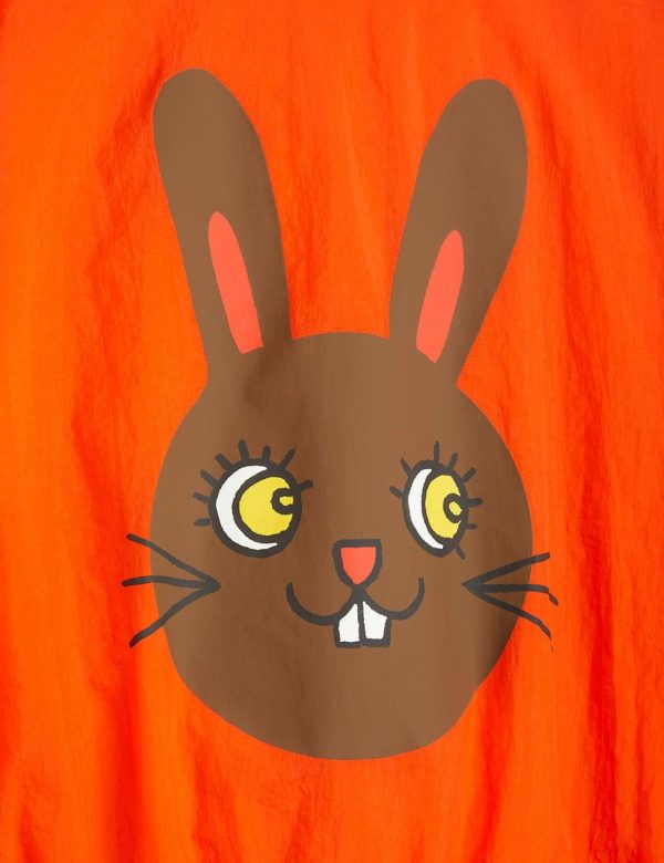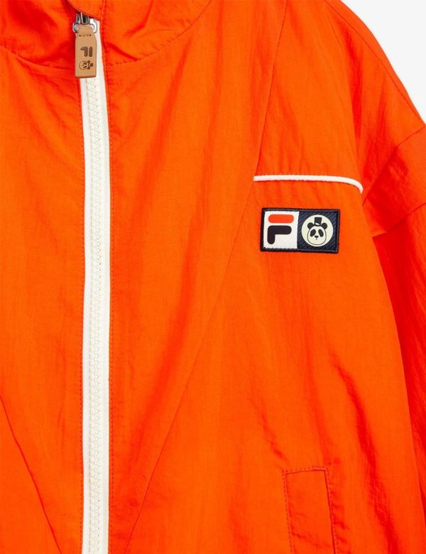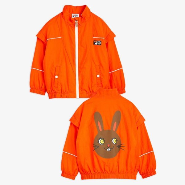Red track jacket with a large Rabbit print on the back, made from 100 % recycled polyamide. Designed for an oversized fit, featuring two front pockets with Mini Rodini branded snap buttons, zip closure and a FILA x Mini Rodini collaborative logo pull tab and patch on the chest. Lined with breathable mesh.