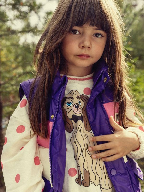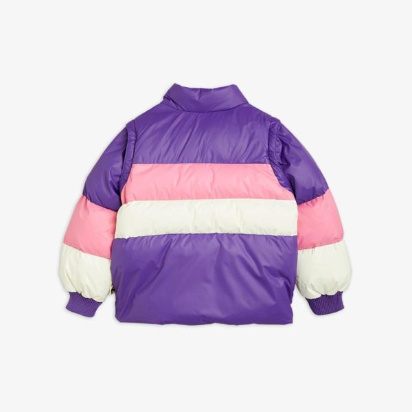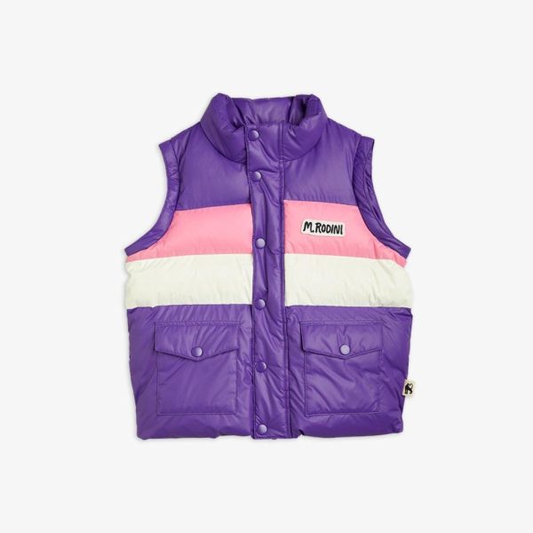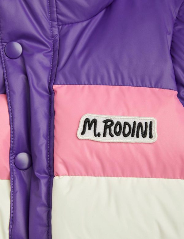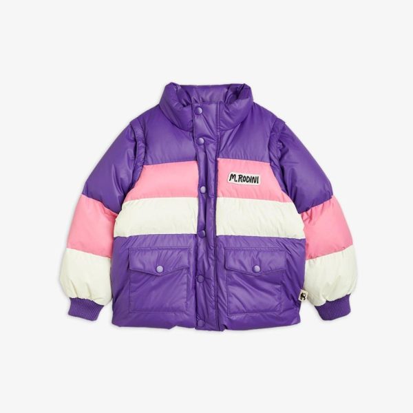 Purple water resistant and windproof heavy puffer jacket with an embroidered M.Rodini logo, made from 100 % recycled polyester. The jacket is designed with removable sleeves to turn the jacket into a vest, two pockets and soft satin lining. Perfect for colder days in the city or at school.