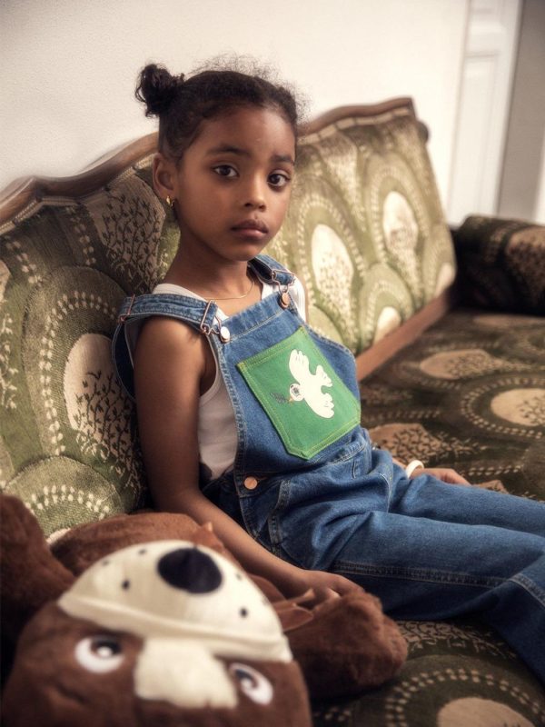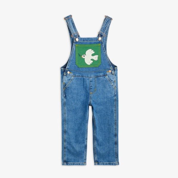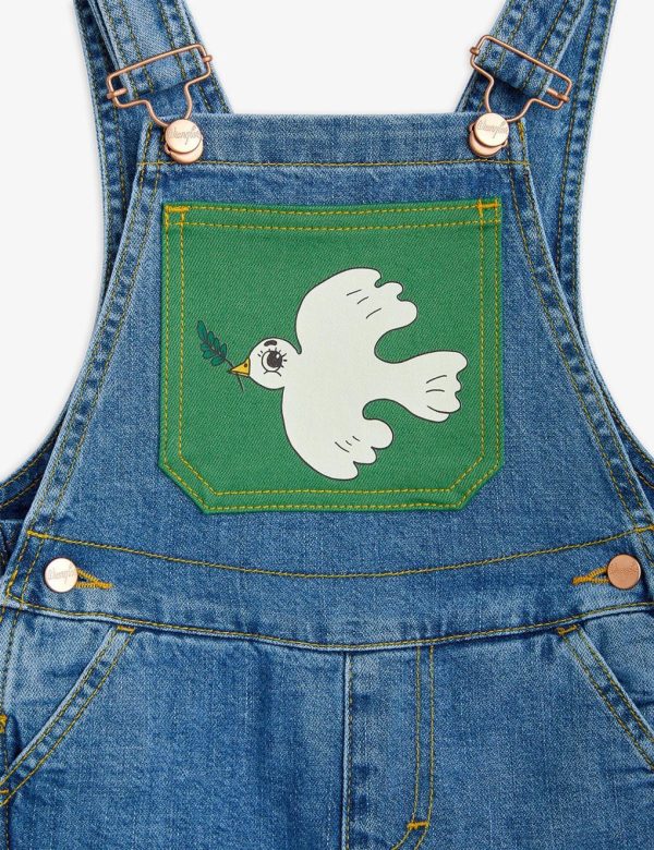 Denim dungarees in 100 % certified organic cotton with straight legs and adjustable shoulder straps. Designed with a large green chest pocket with a Peace Dove print as well as side and back pockets.