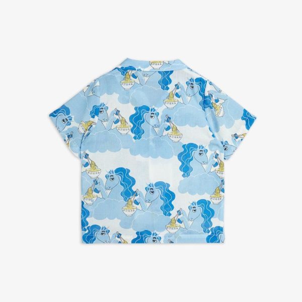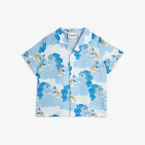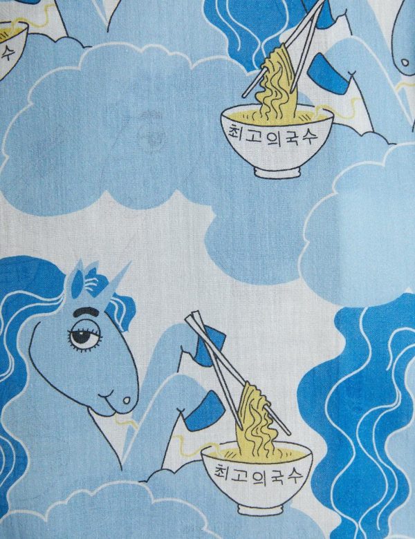 Upcycled woven shirt with an all over Unicorn Noodles print, made from 100 % GOTS certified organic cotton. Designed with short sleeves, button closure and a cuban collar.