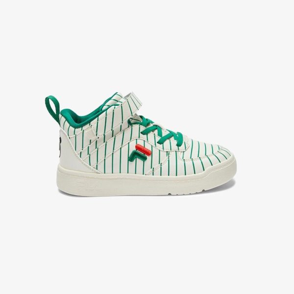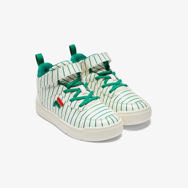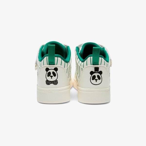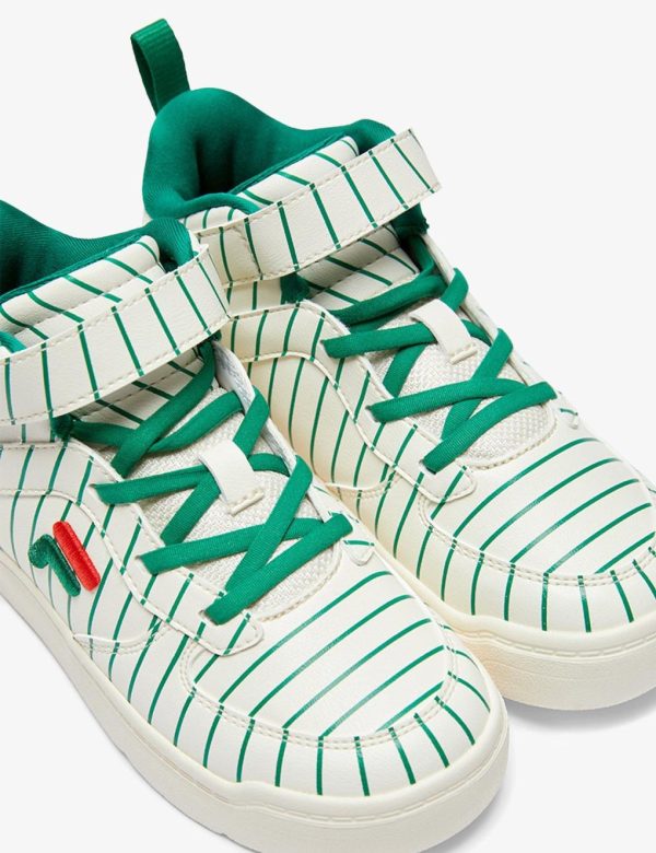 White mid-top faux leather sneakers featuring printed green stripes, the FILA F-logo on the side panels along with debossed Mini Rodini Panda symbols on the heel. Designed with stretchy knot-free laces, velcro-fastened straps along with a padded and ribbed tongue. Cushy EVA-soles ensure all day comfort and the heel loops make putting these shoes on a breeze.