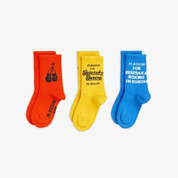 Three pack socks made from a GOTS certified organic cotton and polyamide mix with stretch. The socks are soft to the touch, comfortably stretchy and have reinforced toe caps and heels. M.Rodini for Besesaka is printed under each foot.