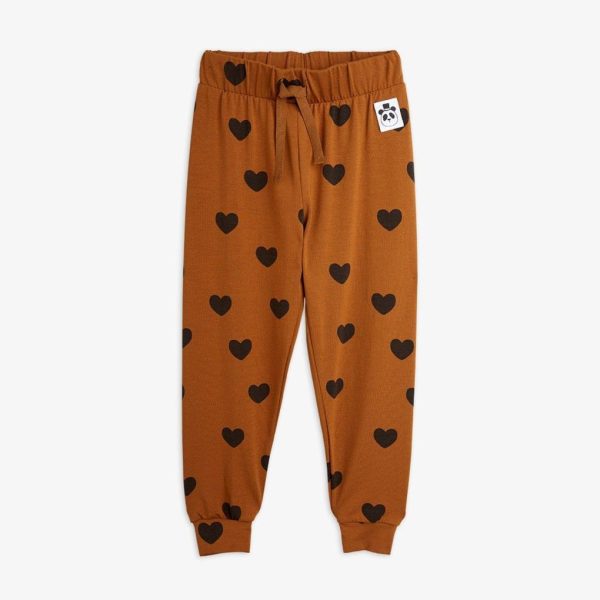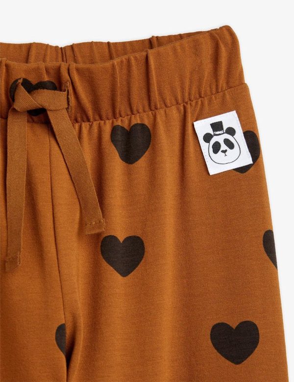 Soft jersey trousers in brown with an all over Hearts print, made in soft TENCEL™ Lyocell with a hint of stretch for comfort. The trousers are designed with a soft elastic drawstring waist, cuffs at the bottom as well as a sewn-on Mini Rodini Panda label in the front.
