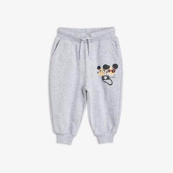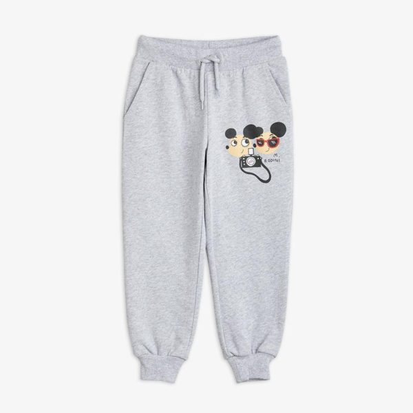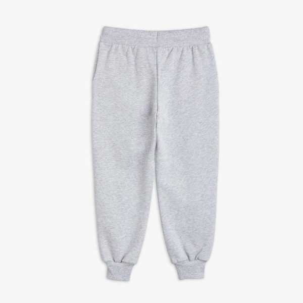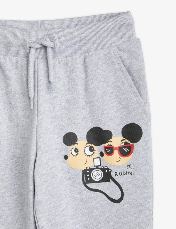 Grey sweatpants featuring a Ritzratz print on the left leg, made from 100 % GOTS certified organic cotton. The sweatpants are designed with a ribbed waist and cuffs, two pockets as well as an elastic drawstring waist.