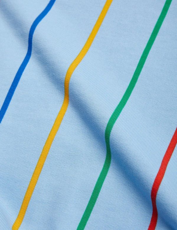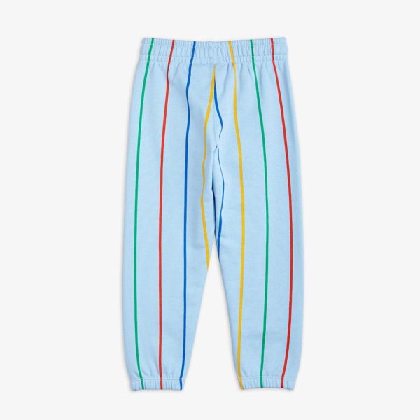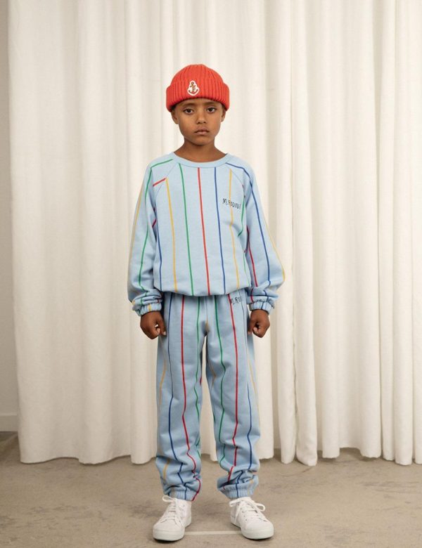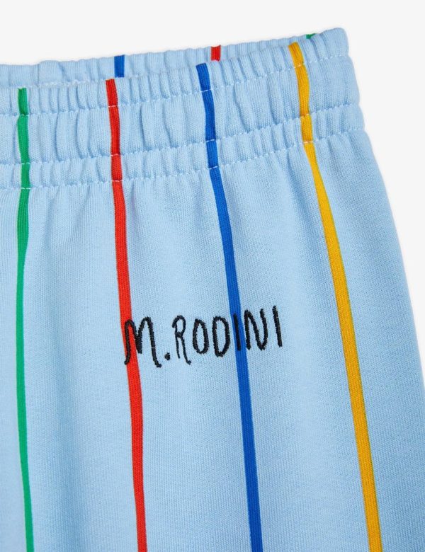 Blue sweatpants featuring an all over Stripe print and a M.Rodini logo, made from 100 % GOTS certified organic cotton. The sweatpants are designed with a ribbed waist and cuffs, two pockets as well as an elastic drawstring waist.