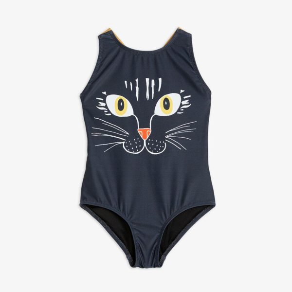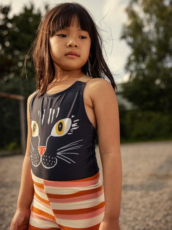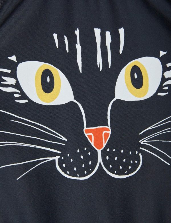 Black cross back UV swimsuit with a large Cat Face print, made from recycled polyamide with stretch.. The fabric creates a physical barrier against the sun’s UV rays with the highest ultraviolet protection factor, UPF 50+.