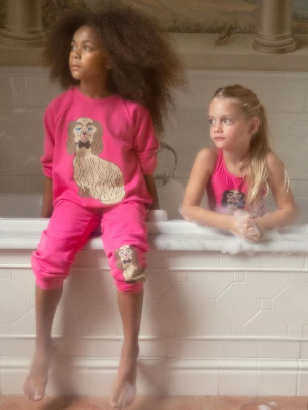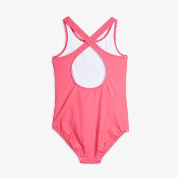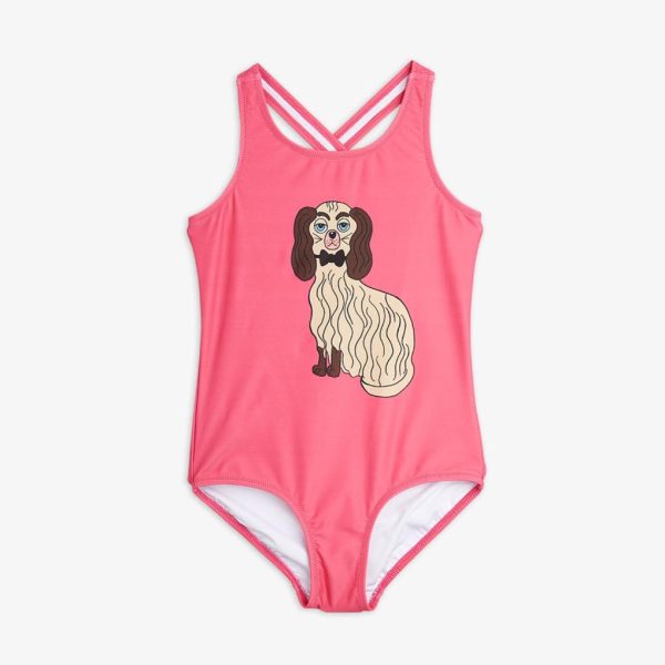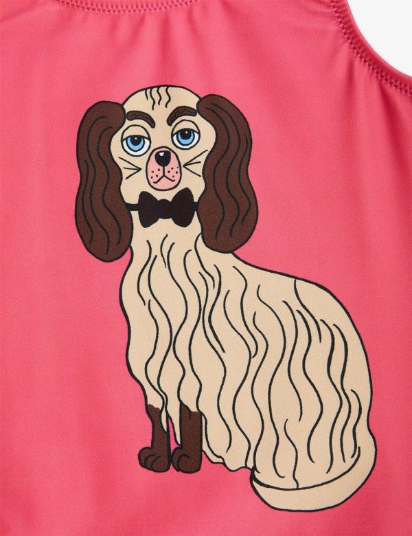 Pink cross back UV-swimsuit with a large Dashing Dog print on the chest, made from ECONYL® regenerated nylon with stretch. The fabric creates a physical barrier against the sun’s UV rays with the highest ultraviolet protection factor, UPF 50+.
